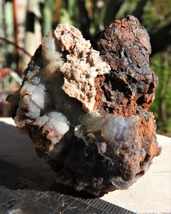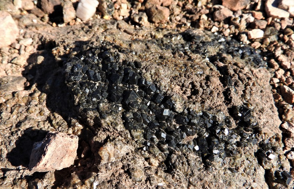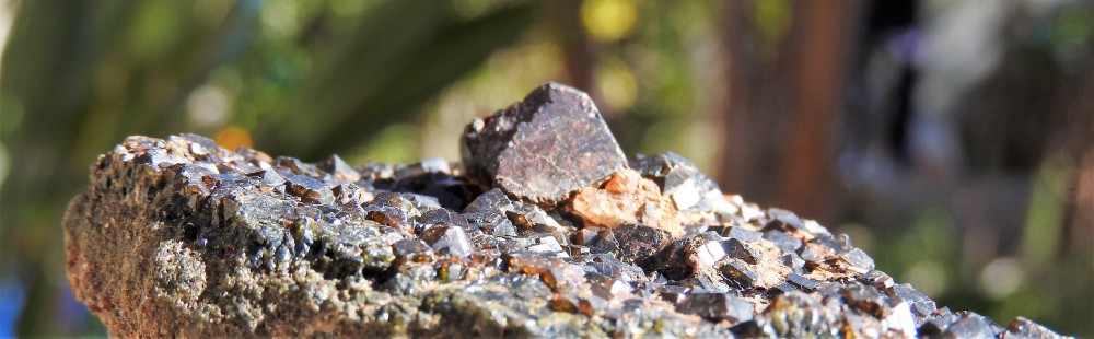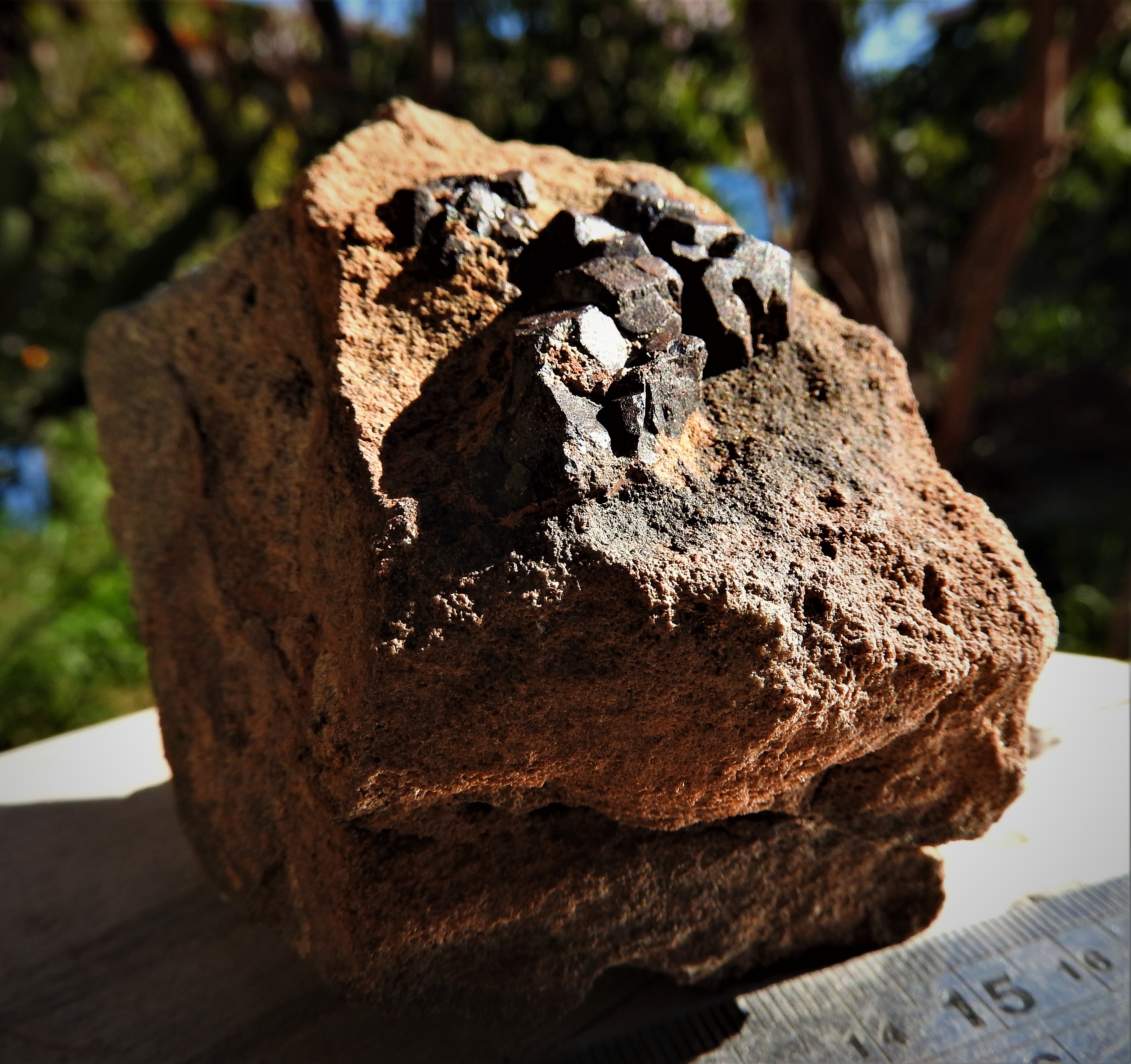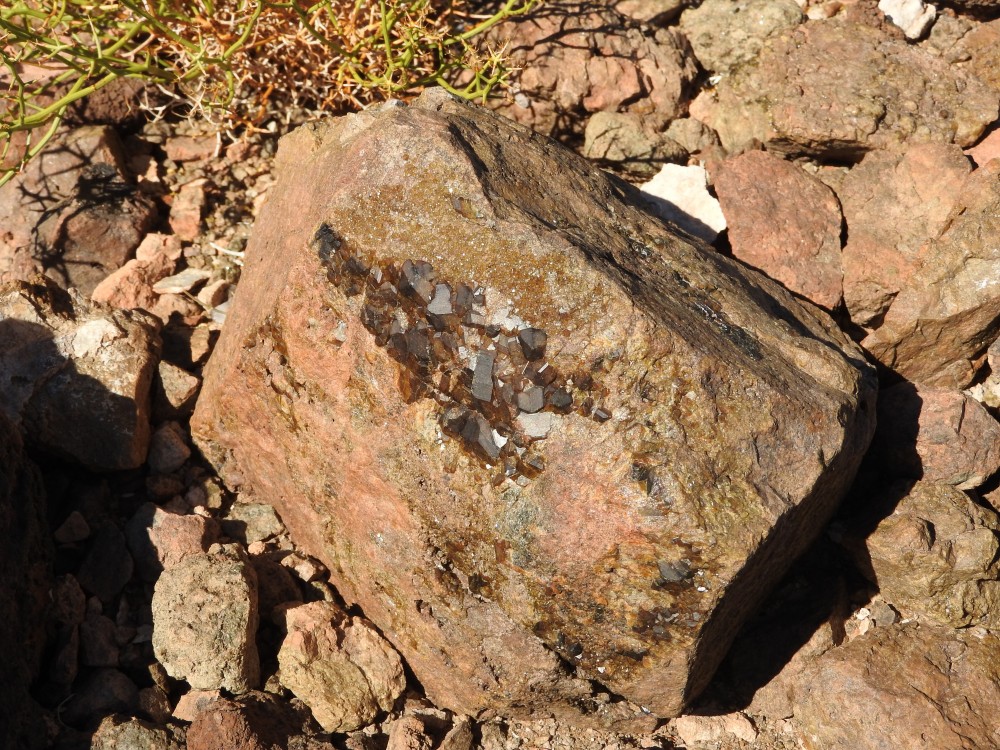 je suis toujours à l'ombre, la vue est sympa et une veine de grenats  affleure entre ces couches ,  comme ci-dessous,, dans les cavités  dues à l'érosion ,
