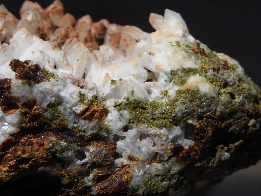 pour le vert, il y a vraiment beaucoup d'épidote dans le coin, massive  le plus souvent , associée au quartz , calcite et pompom , du grenat