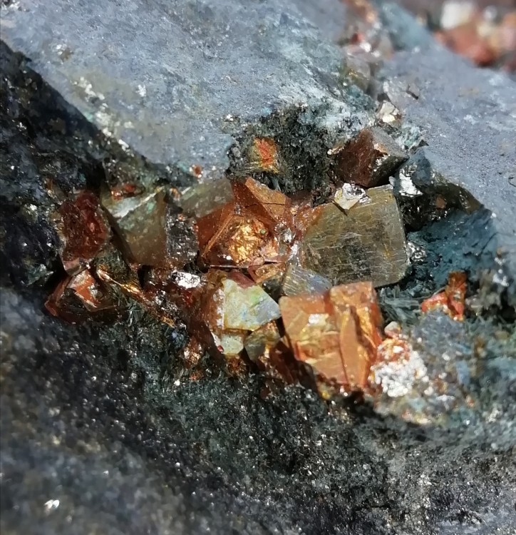 Salut et merci pour vos commentaire. De retour dans le nord du pays, passage pres de la Farola ou le bleu est toujours aussi intense. On trouve aussi quelques pyrites cubiques avec un minerales vert fibreux asocié, si vous avez une idee de ce que ca peut etre? Merci, a bientot.