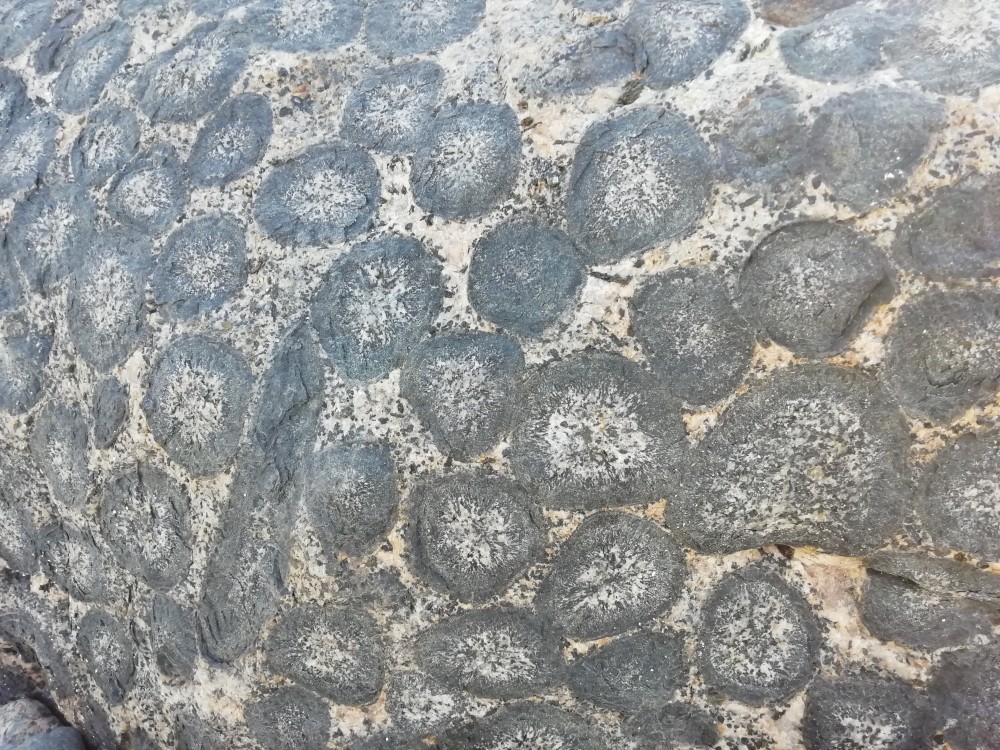 Voila pour les fossiles, a 1/2 heure plus au nord, sur une plage, juste 365 m carres de granite orbiculaire, voila pour la composition,