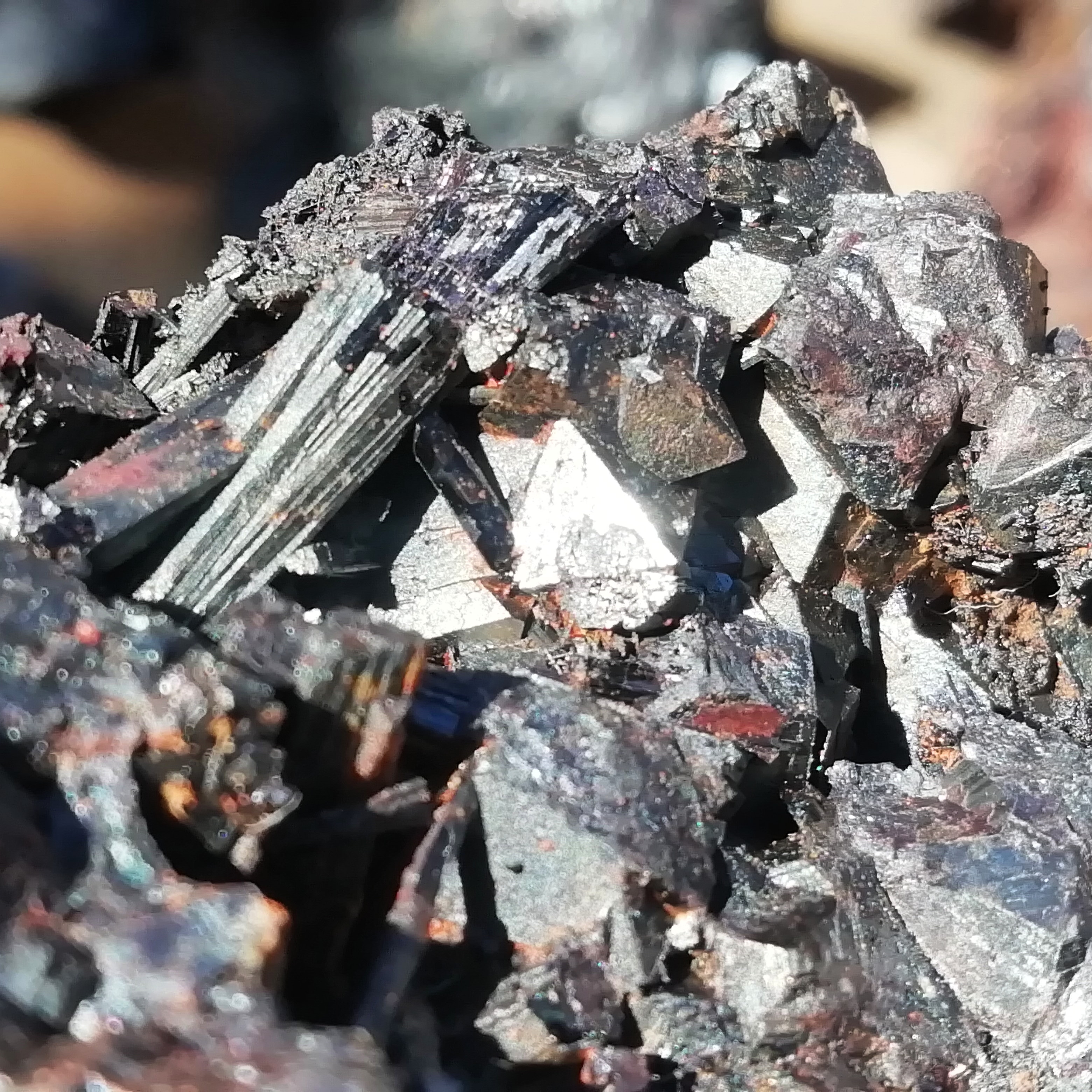 est-ce vraiment de la tourmaline / schorl ? si c'est métallique.. en association avec de la magnetite, je ne sais pas si c'est une paragénèse connue -> confirmé sur mindat,  c'est possible, les irisations et oxydes de fer pourraient résulter de l'altération de la magnétite en dépôt sur le schorl