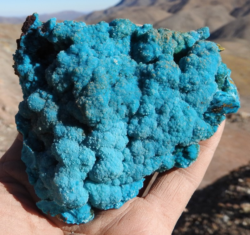 les cristaux verts sont bien atacamite (pas signalée sur le site !) ; la partie interessante est plus à l'Est (dos adriana)  : los azules a surtout beucoup de chrysocolle ; dos adriana c'est plus libethenite et brochantite (dans les oxydes de fer) la libethenite est en gerbes de baguettes vert olive  pas en cristaux trapus vert foncé