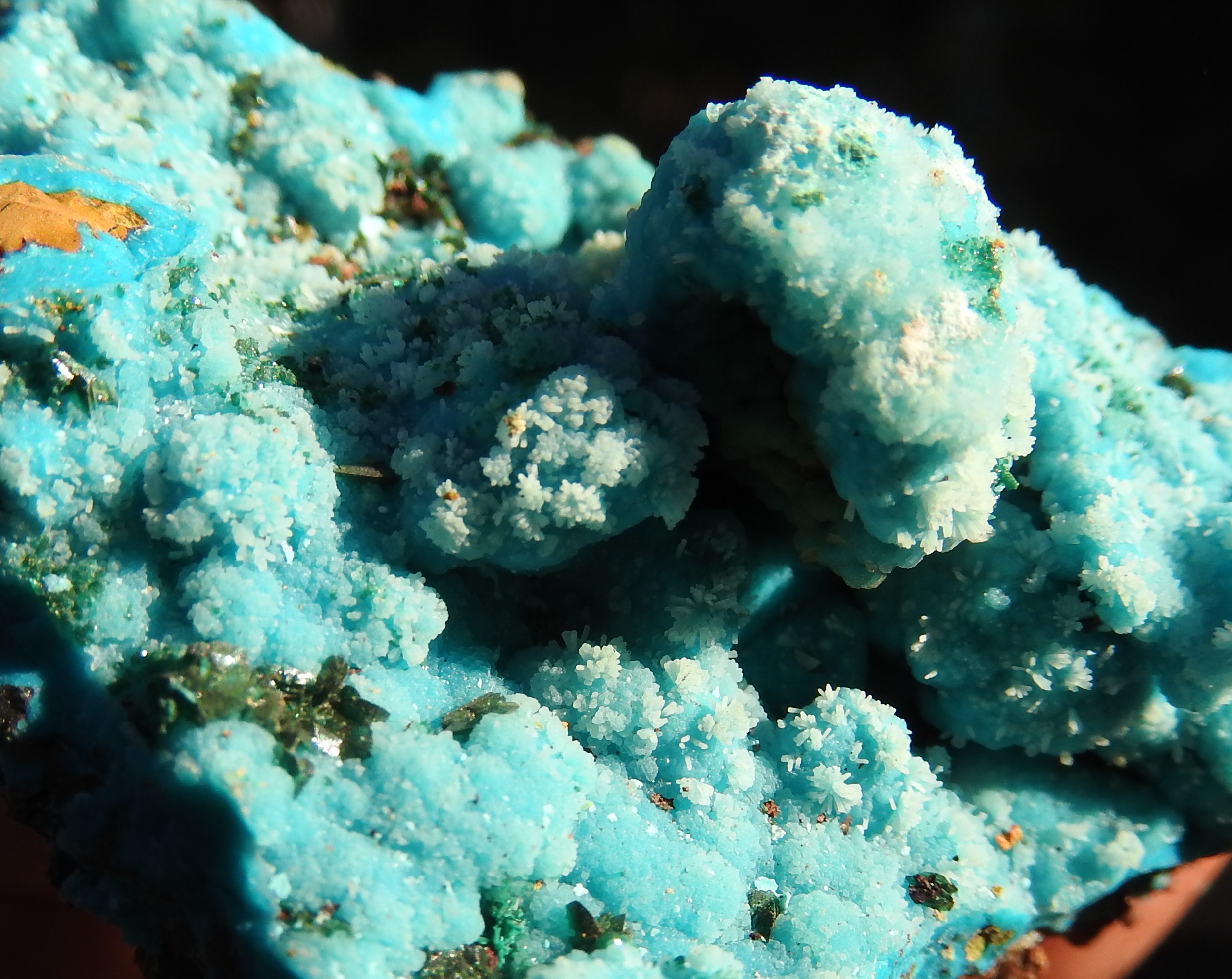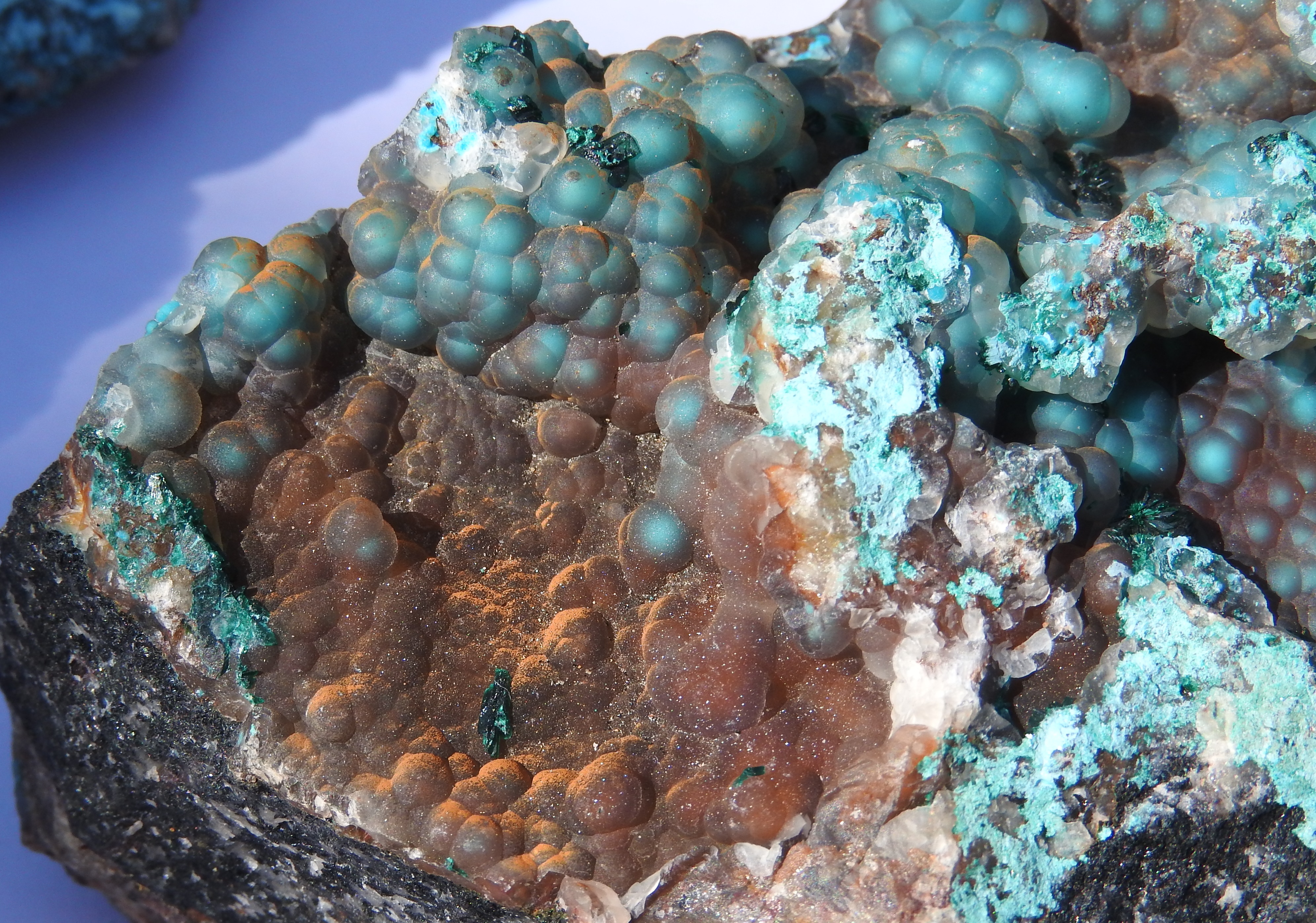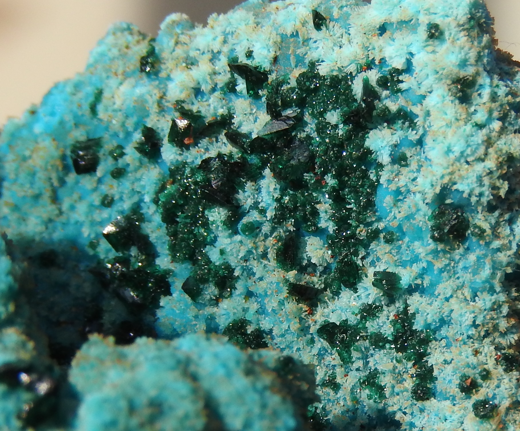 les cristaux verts plus trapus : libethenite  ;  sur dos adriana , avec le fond bleu tu peux avoir des aiguilles plus brillantes de dioptase