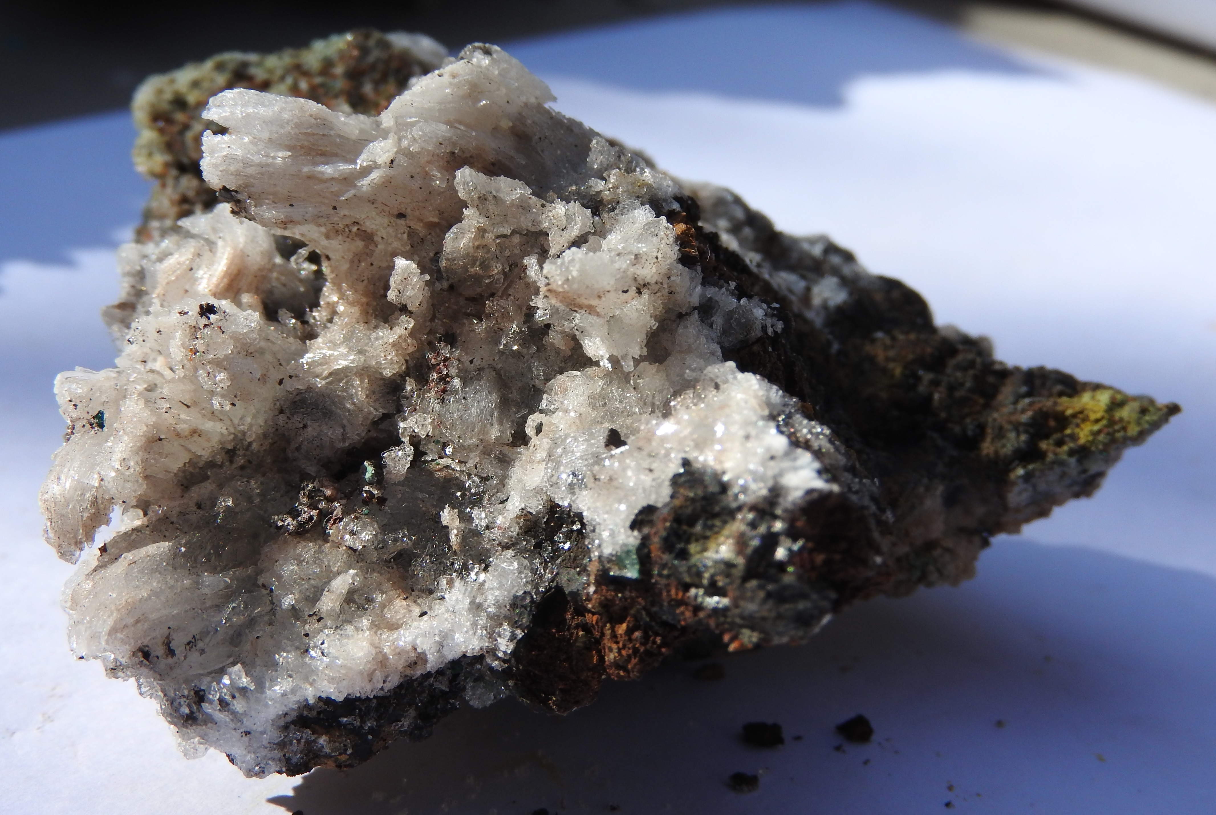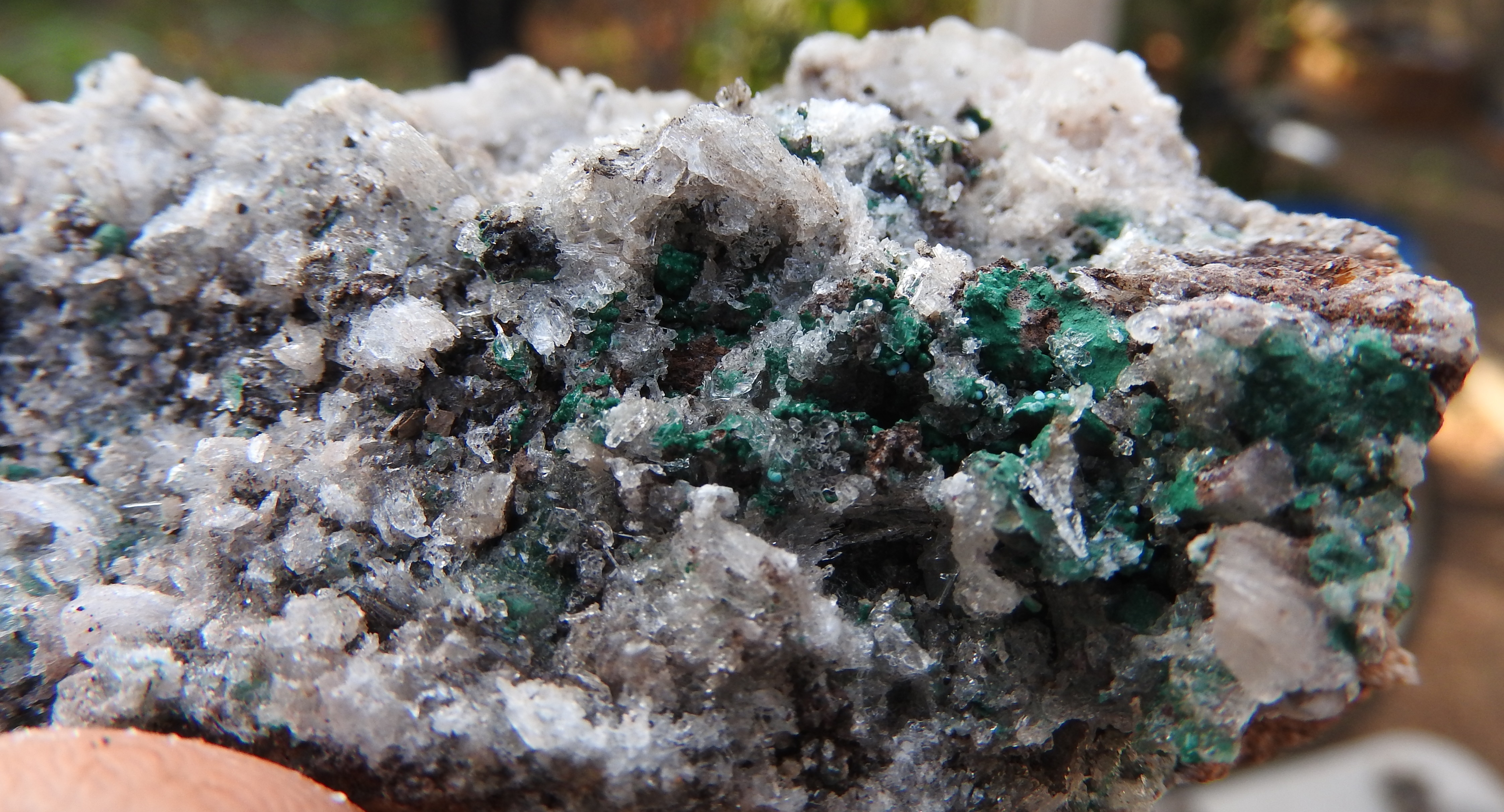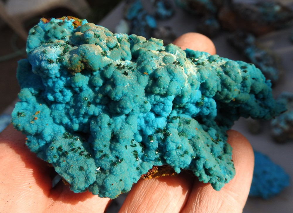 quelques pièces de sorties, chryso recouverte de calcédoine mais je suis pas sur, mais très cristallin, avec peut être une recristallisation, fine gerbe de cristaux blancs , voir plus loin, quelques une saupoudrées d'atacamite ?