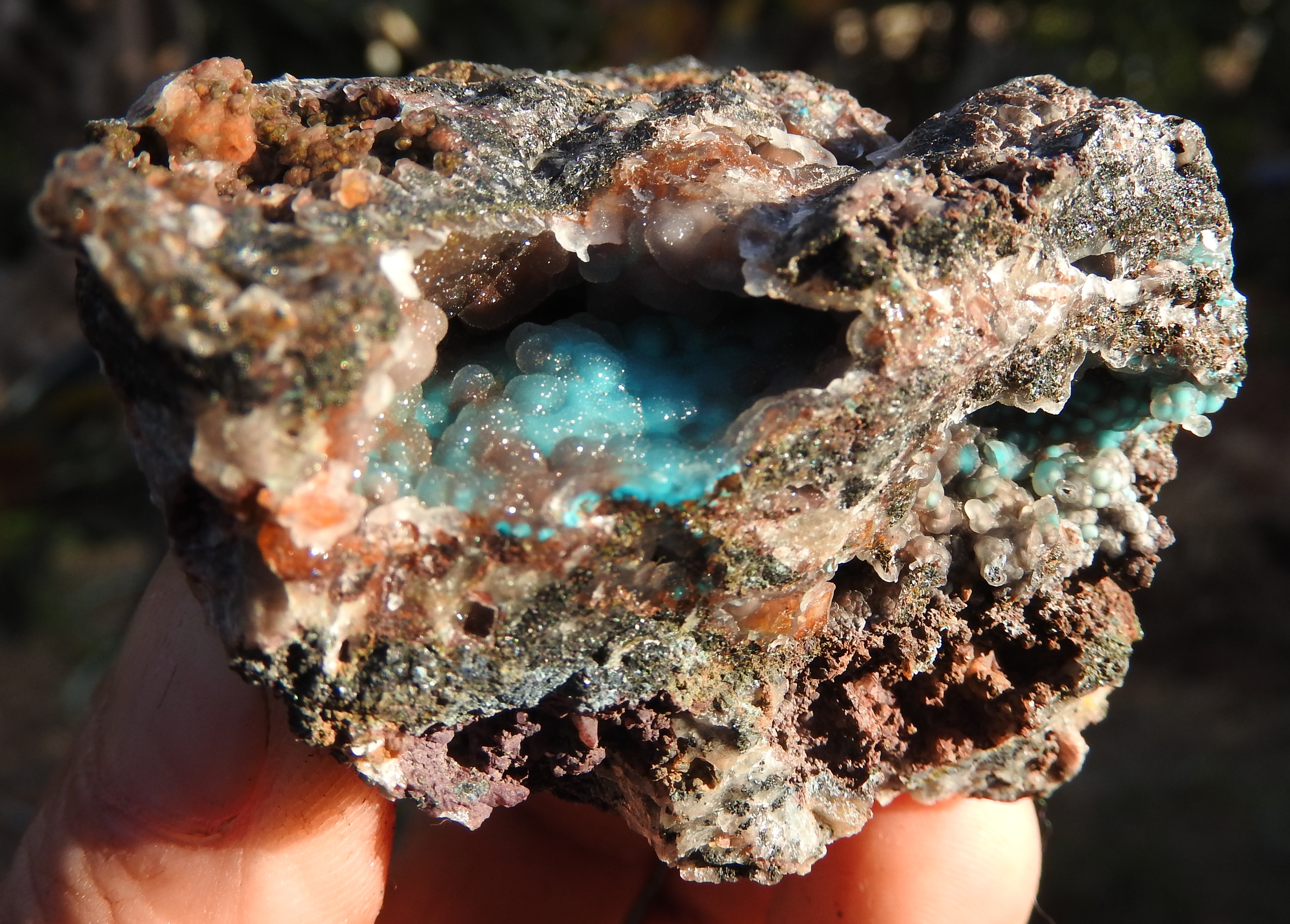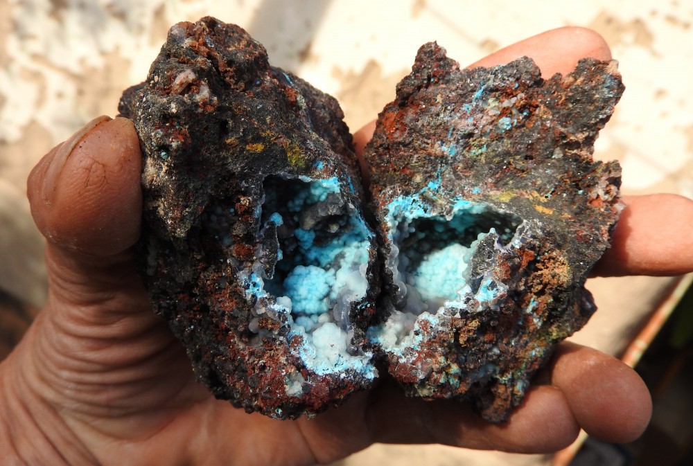 une phase primaire filonienne "classique" avec gros cristaux de quartz et sulfures puis une seconde phase d'alteration/dissolution avec chapeau de fer  et melange silice/oxydes de fer donnant un ensemble tres caverneux moulé sur les cristaux de quartz puis en phase terminale chrysocole, silicates cuprifères sur les parois de cette "roche"
