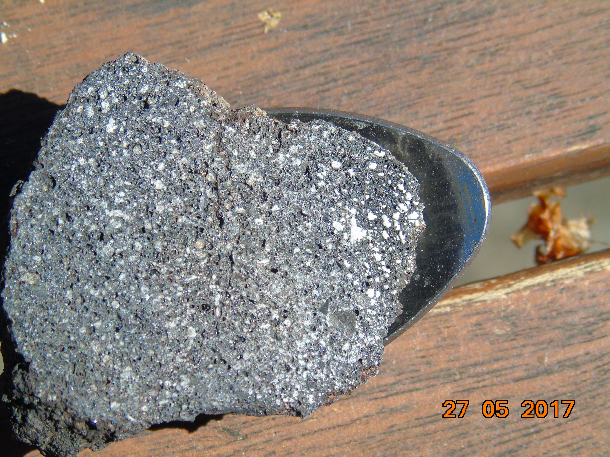 Il reste trois aspects différents, une matrice poreuse gris moyen, des inclusions plus claires et quelques grains d’aspect vitreux.