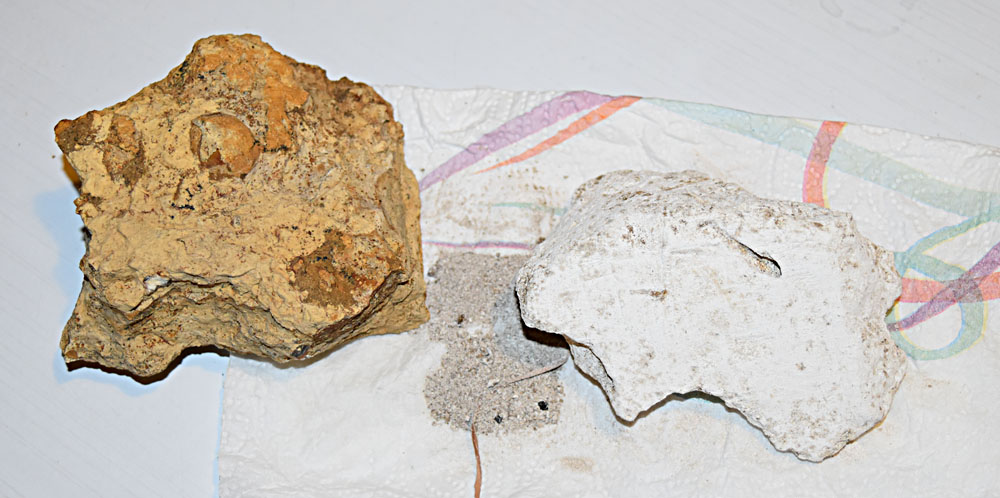 Celui de gauche est un calcaire tendre que je viens de laver mais pour celui de droite j'ignore si c'est de la craie ou de la chaux. Il se raye très facilement. J'ai trouvé qu'il pique un peu les doigts d'où ma question.