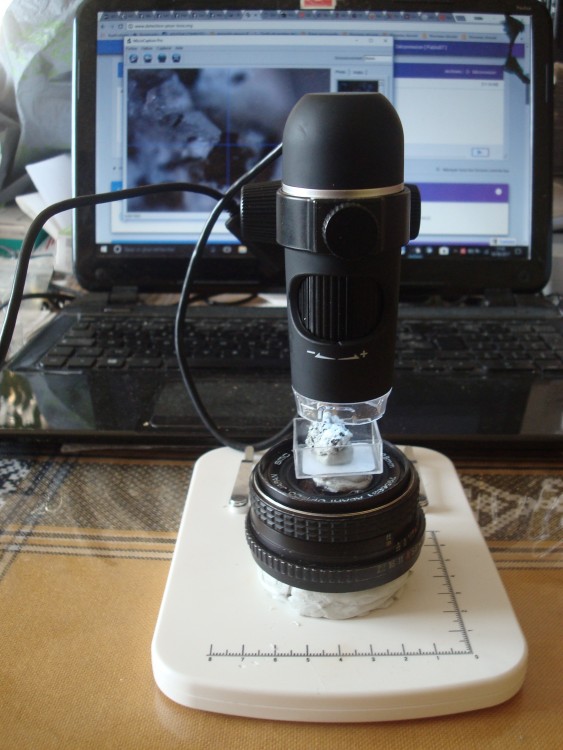 C'est vrai que c'est le prix d'un équipement photo classique performant, mais c'est beaucoup plus simple à utiliser. La difficulté, que je dois travailler mais je n'ai pas trop le temps, c'est l'éclairage de l'échantillon. Actuellement j'utilise uniquement l'éclairage incorporé réglable de la bino en le tamisant avec des bouts de plastique dépolis, mais ce n'est pas suffisant pour supprimer tous les reflets, surtout avec des minéraux compliqués tels que la cuprite.