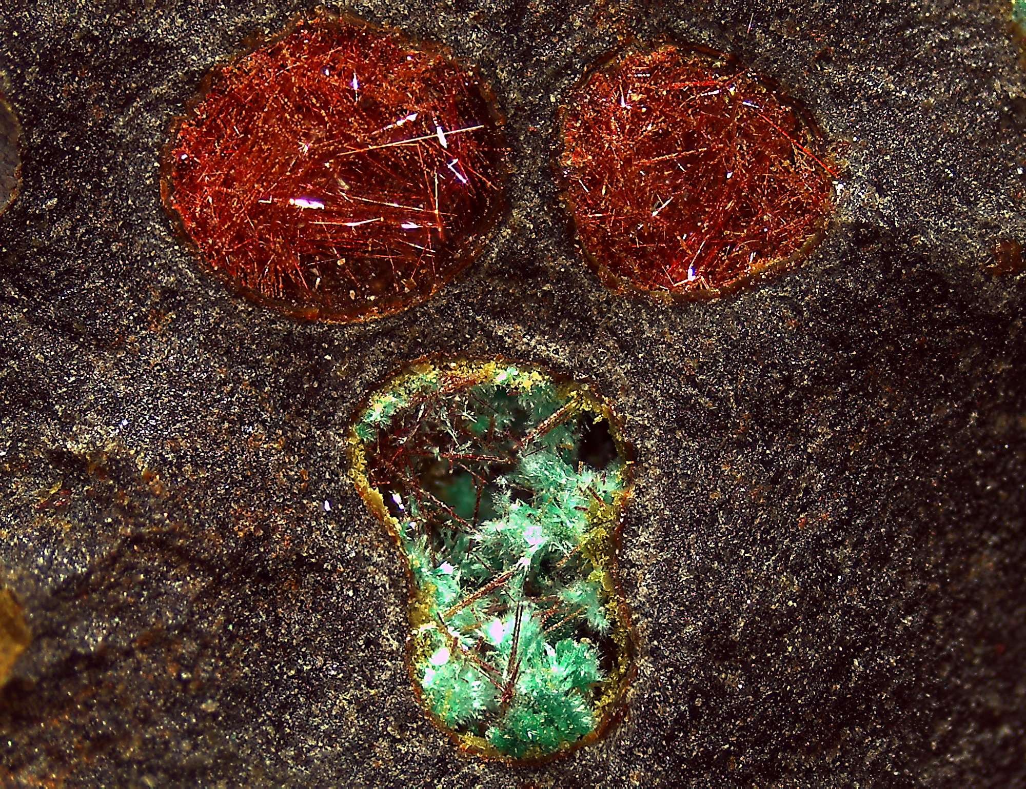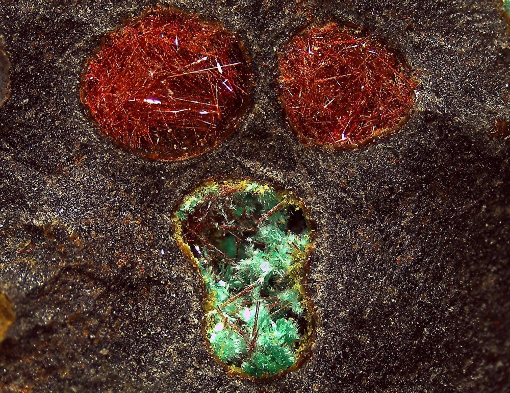 - la chalcotrichite en aiguilles très fines pouvant parfois faire de véritables amas plus que centimétriques. Ces aiguilles sont souvent plus ou moins transformées en silice, couvertes de malachite, enrobées de chrysocolle, etc...