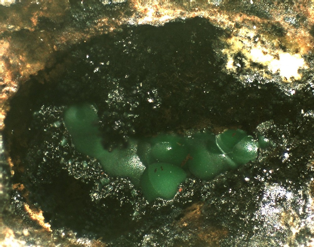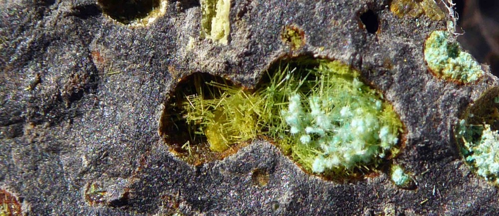 Pourquoi pas aussi à la zalesiite? Un petit coup d'EDS devrait résoudre facilement la question, il serait même très étonnant que personne n'ait fait réaliser ce genre d'analyse. La paragenèse générale des espèces secondaires  des divers contextes de ce gisement semble très "classique" au vu de ce qui est paru actuellement sur géoforum et mindat. Seule la gangue basaltique est très originale. Difficile donc de brancher un scientifique là-dessus (surtout sur des secondaires!)  mais des amateurs motivés peuvent très bien réaliser un inventaire et le publier (encore que je préfère publication suivie de photos sur internet à l'inverse qui "déflore" trop le sujet). Beaucoup de temps et de travail en vue!