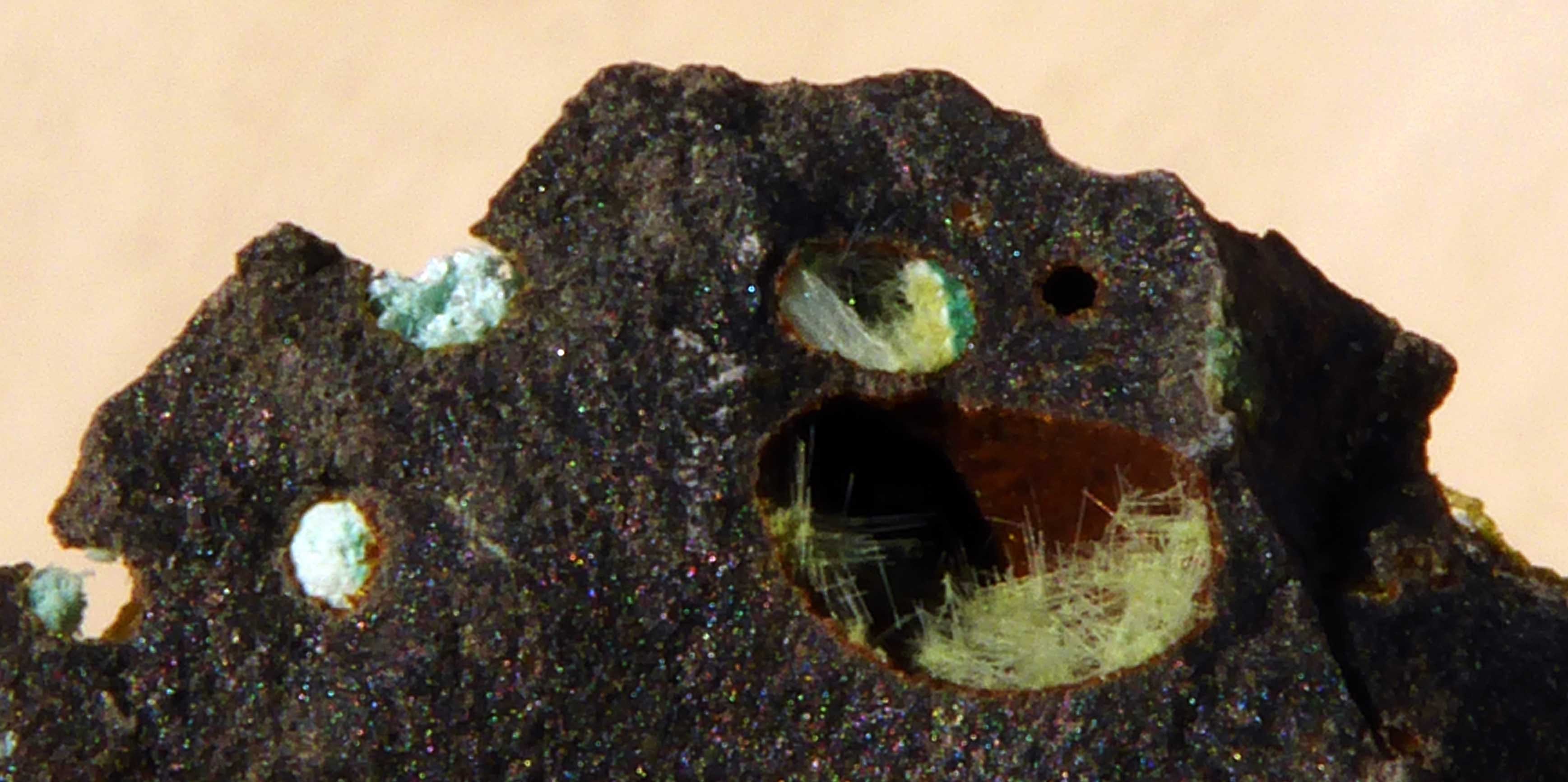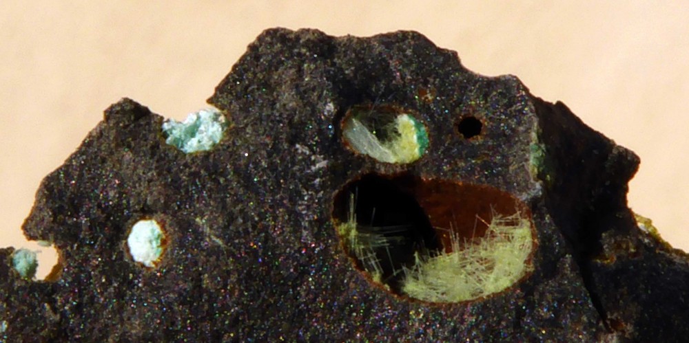 La chalcotrichite d'une des photos est originale du fait du fond très clair inhabituel de la vacuole. Je ne sais pas trop ce qu'est le minéral blanc: calcite ou aragonite peut-être