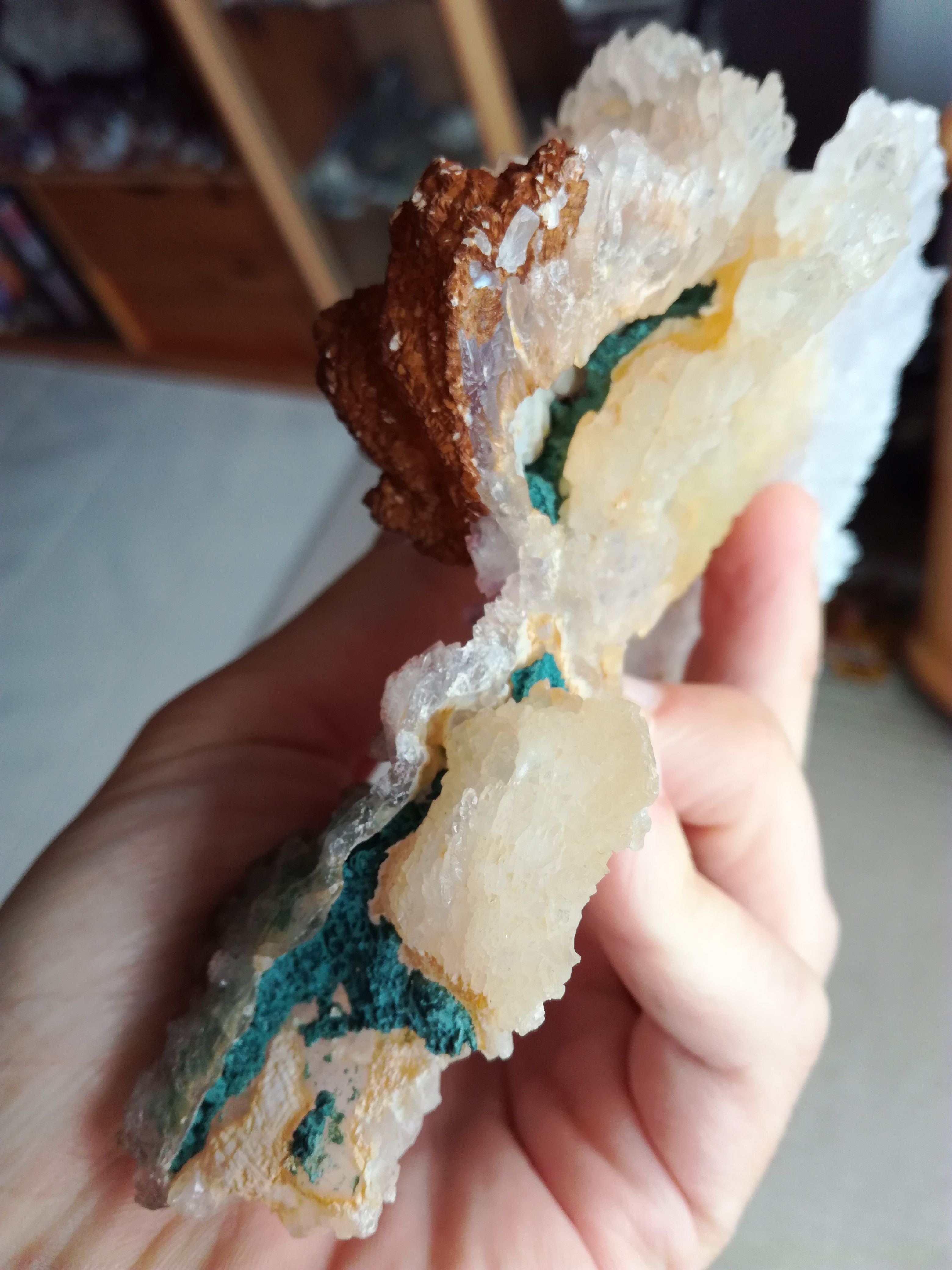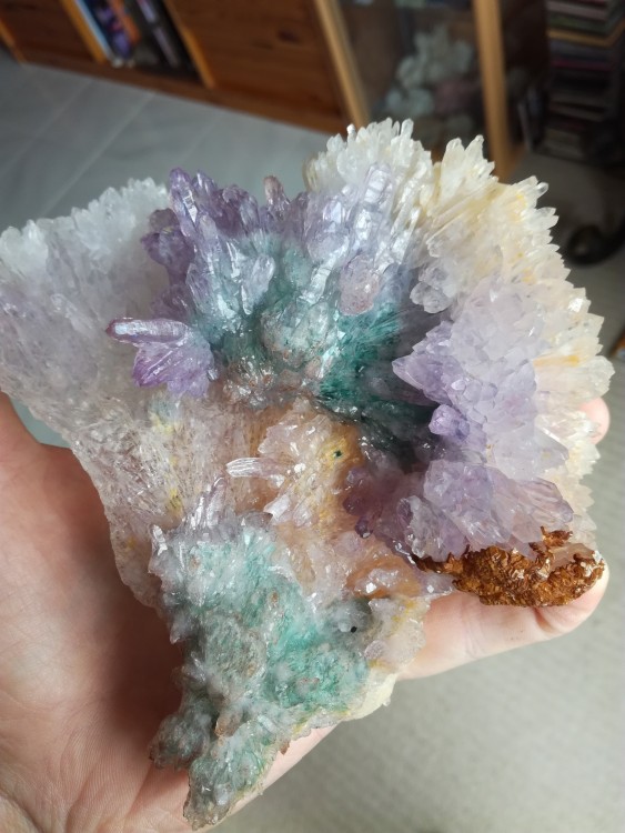 Fleur d amethyste en assoc avec calcite, inclusions de celadonite (pour le vert bleu) et rutile/hematite.