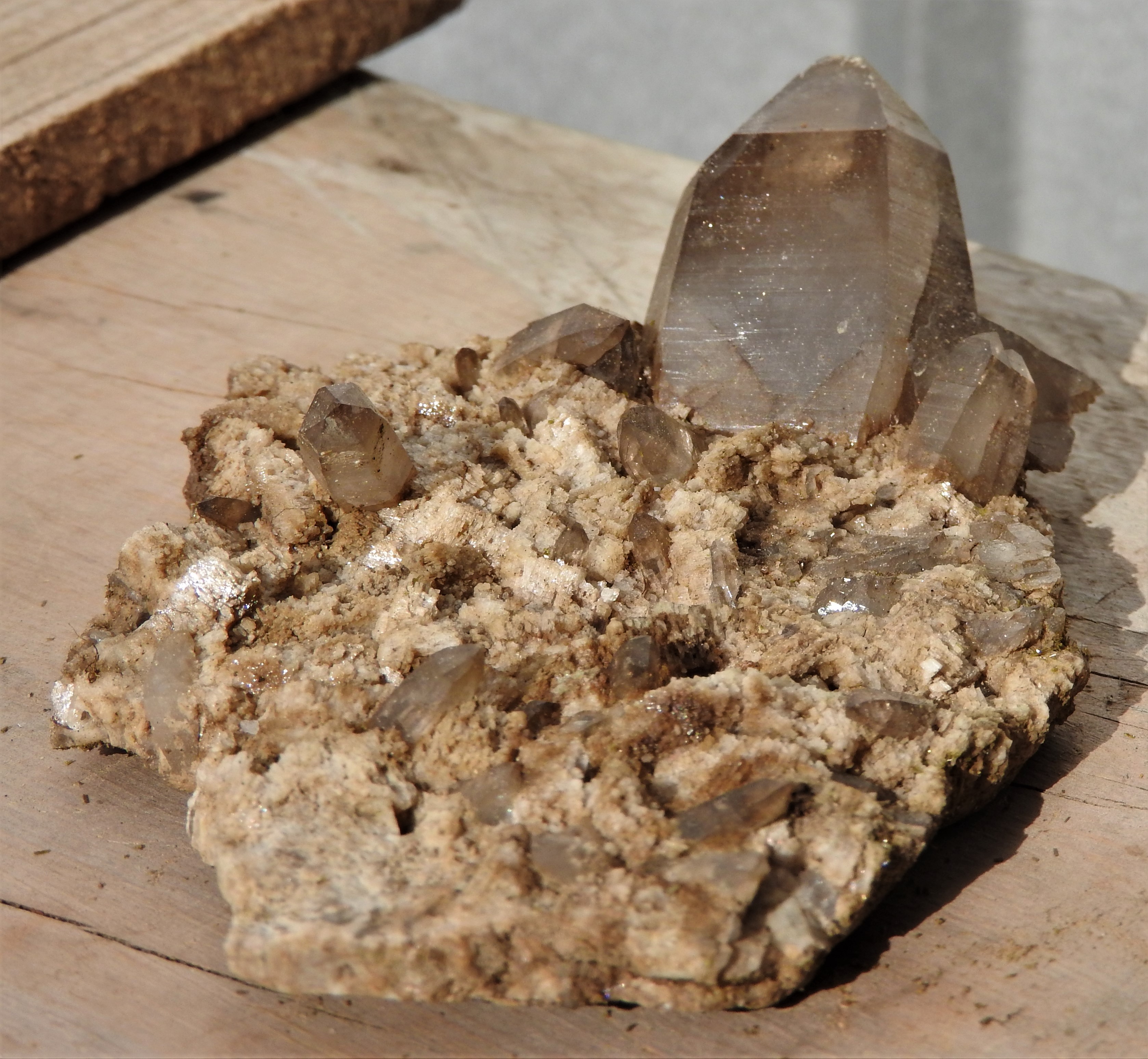 pas équipé de chaussures semirigides, je me limiterais à inspecter les gros blocs morainique et le pied des falaises accessibles, résultat:  deux poches, une toute petite avec quartz fumé ,epidote en aiguilles, et une autre cristalisation qui me fait penser a de l'ortoclase sous toute reserve,