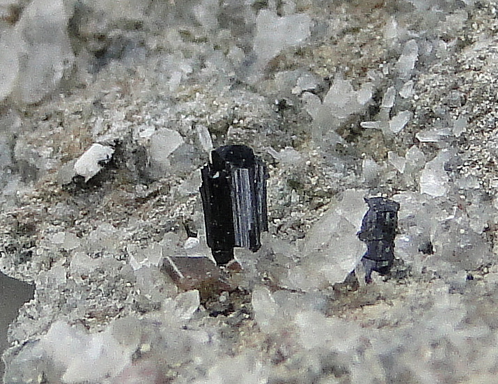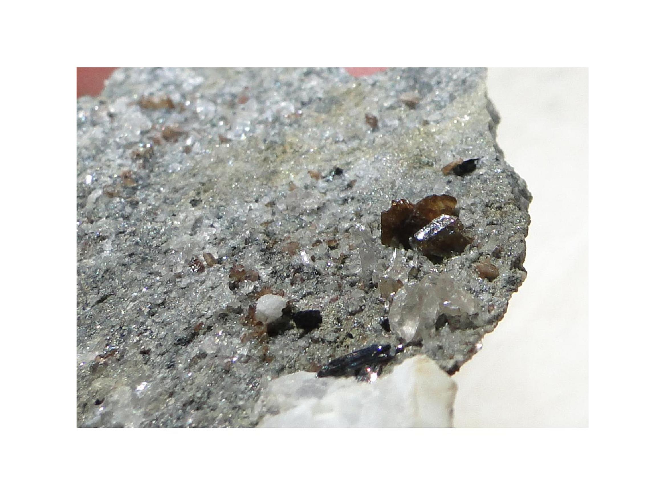 On pourrait penser schorl et axinite... tous les deux minéraux du bore. Ce serait assez logique. Mais je ne pense pas. Les cristaux roses ont l'air d'être plutôt des sphènes et le cristaux noirs montrent clairement des empilement de cristaux plats, et la tourmaline ne fait jamais ça. En outre les terminaison sont un peut trop aigüe. Cela existe en tourmaline mais c'est plutôt rare.