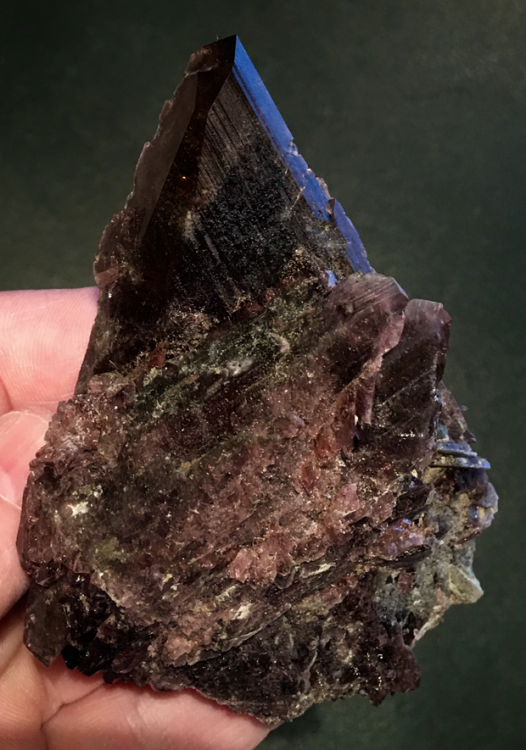 Le 1 juin 1990, j'ai acquis du fameux cristallier Gérard Meil, mon ami, un fort ensemble d'axinites trouvées par deux autres leaders de la minéralogie d'Oisans, Alain Estadès et Roland Chincholle, qui appartenaient à la collection d'Alain. Il y avait un sac de bouts de Bachat-Bouloud, qui sont alors passés au plus grand collectionneur vivant (et de tous les temps) Barry Yampol. Il en avait confié à Buzz pour les tailler ; quelque temps plus tard, un monsieur me courre après dans les allées de Tucson : c'est Buzz que je ne connaissais pas encore. Il me dit : c'est dingue mais je viens de lapider des axinites d'une couleur terrible, la plus belle que je connaisse… français… non… si… alpin… oh ! Il m'a taillé la pierre ci dessus en remerciement pour lui avoir fait découvrir une nouvelle qualité de pierre, taillé dans un cristal cassé de 120mm.