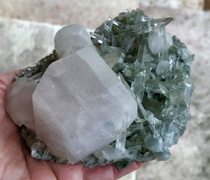 Calcite en rhomboèdres modifiés légérement violacés sur Quartz 'habitus muzo'  [140mm]