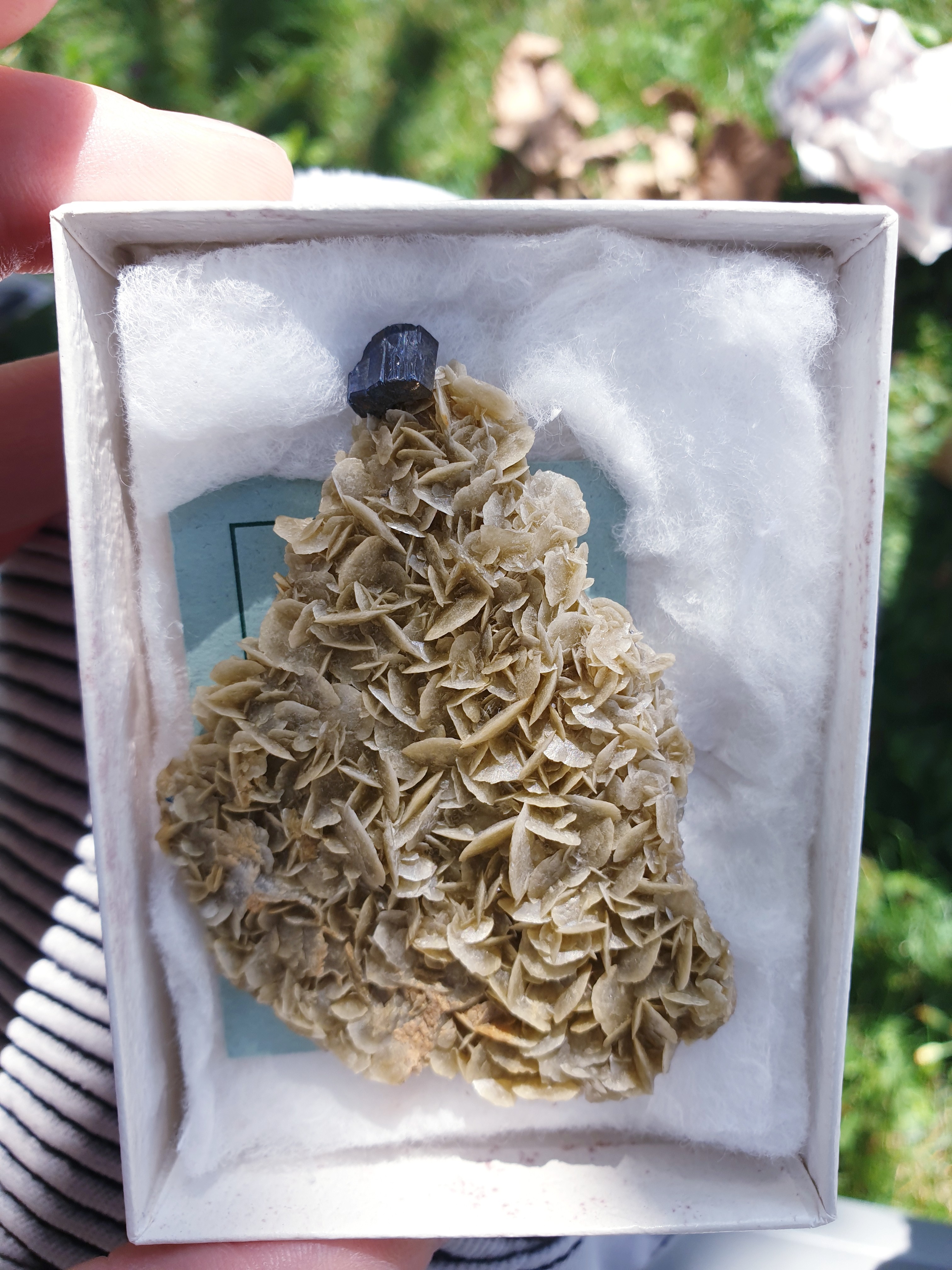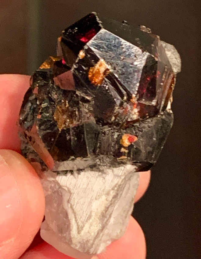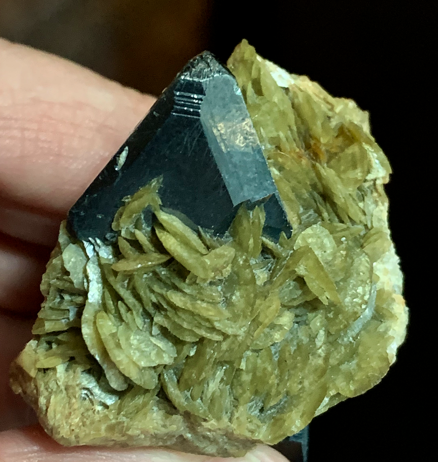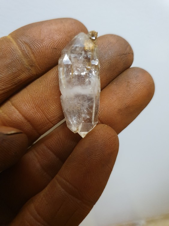 J’ai examiné des cristaux d’environ 3 mm implantés sur les parois d’une géode de quartz. Ils offrent la forme d1 [1120] ; p [1011], b1 [0112] et d2 [2131].