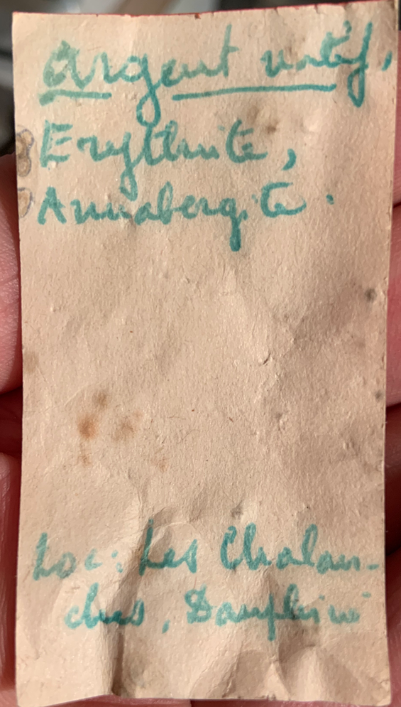 Enfin, j’ai étudié, également dans la collection du Muséum, un vieil échantillon de smaltite ferrugineuse, mélangée à de l’asbolane, des cristaux de löllingite et de l’érythrine. Il renferme des masses cristallines fortement translucides de pyrargyrite sur lesquelles je n’ai pu trouver aucune forme distincte. Il est curieux que cet échantillon si riche en arséniures renferme de la pyrargyrite et non de la proustite."