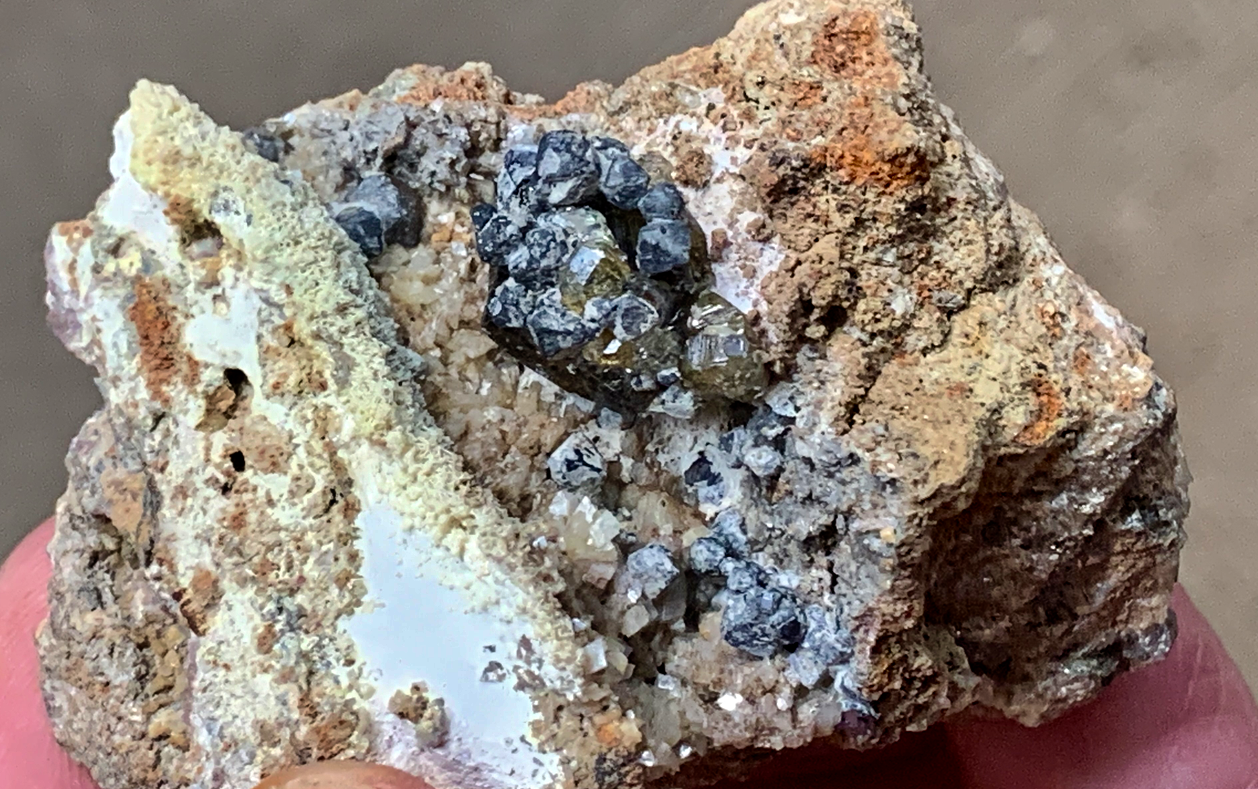 Galène en cristaux octaèdriques légérement altérés (hydrocérusite ?) en croissance orientée (épitaxie) sur un cristal de Blende miel ; traces d'Hydrozincite  [90mm]