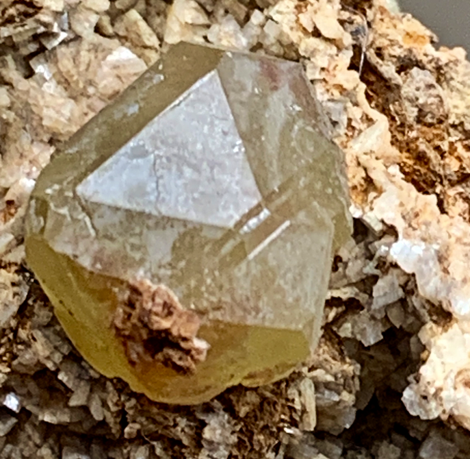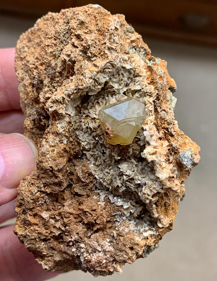 Blende jaune 'cléiophane', cristal cubo-octaèdrique, sur des carbonates altérés et traces d'Hydrozincite [90mm]