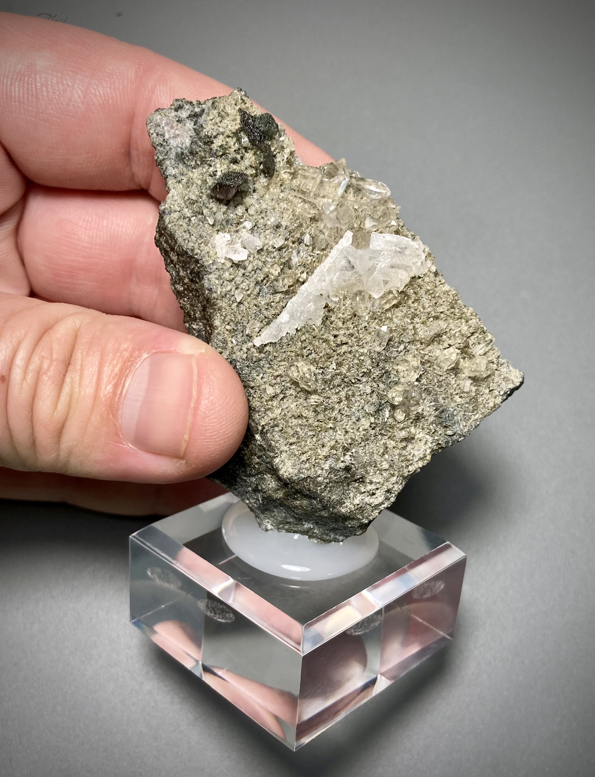 Une pièce sans prétention mais intéressante pour la systématique du site… Axinite, quartz, calcite et épidote (Combe de la Selle, Saint Christophe en Oisans, Isère).
