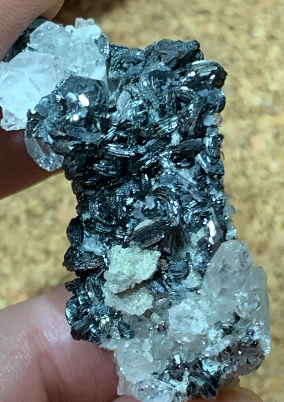 Découverte qui date (plus de 10 ans) mais nettoyage récent. Surprise au nettoyage, ce qui était censé être une vieille croûtasse d'oxydes s'avère être de la purée de quartz redéposée sur les cristaux. C'est comme si une partie de la veine de quartz avait été finement broyée et la poudre était juste tombée en petits tas au fond de la poche - vue la texture bréchique de certains filons dans le secteur, ça me parait une hypothèse plausible.