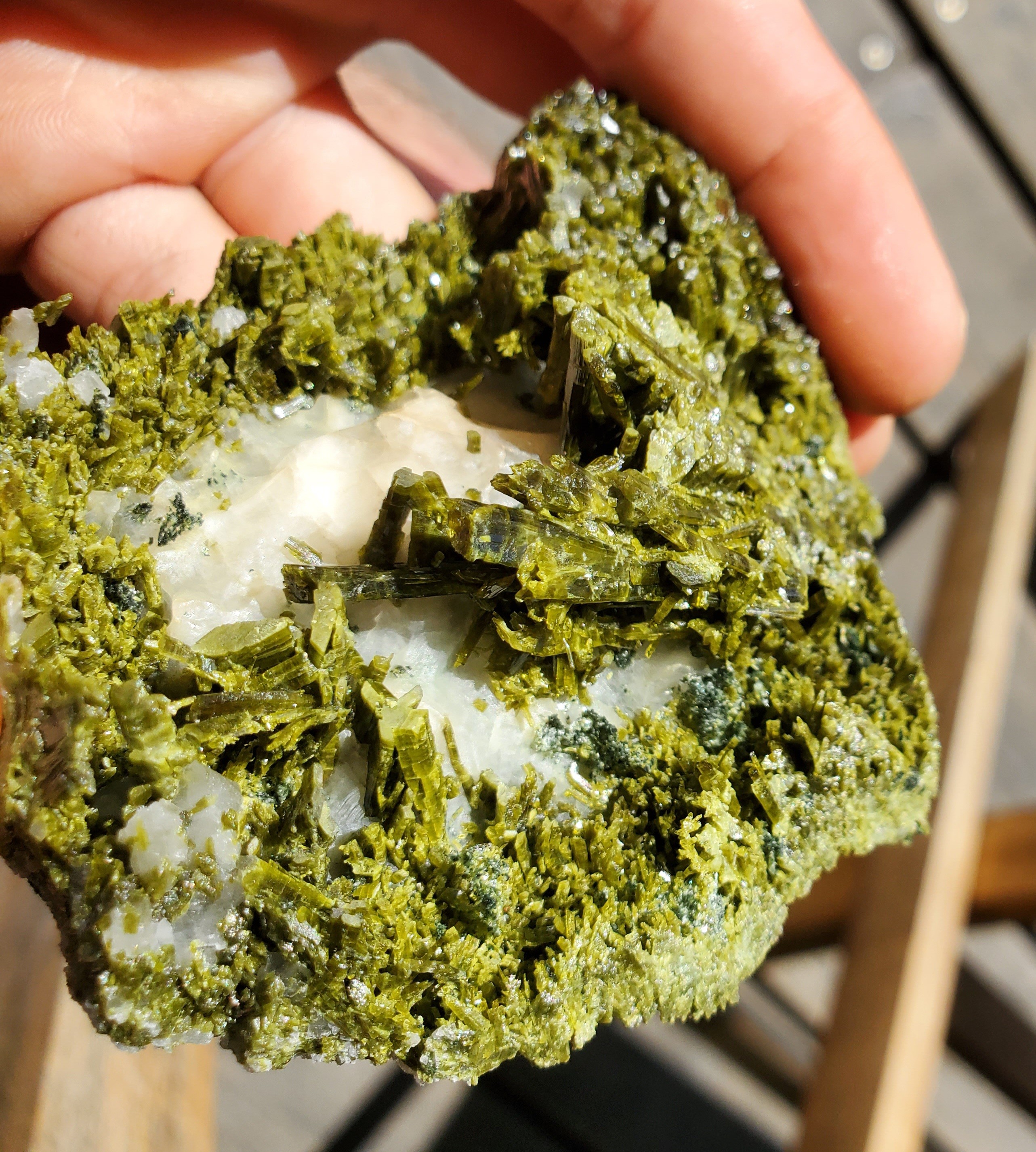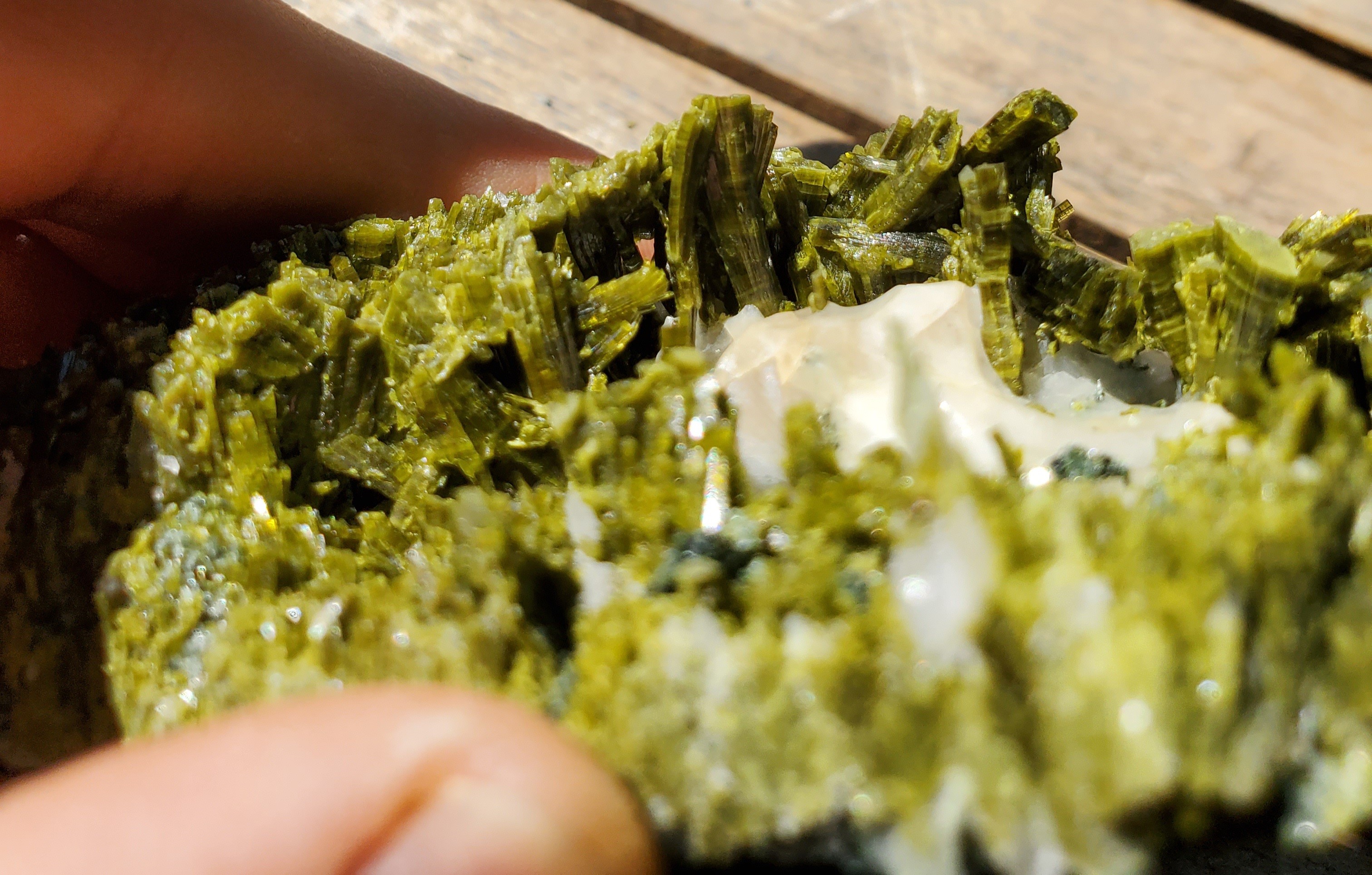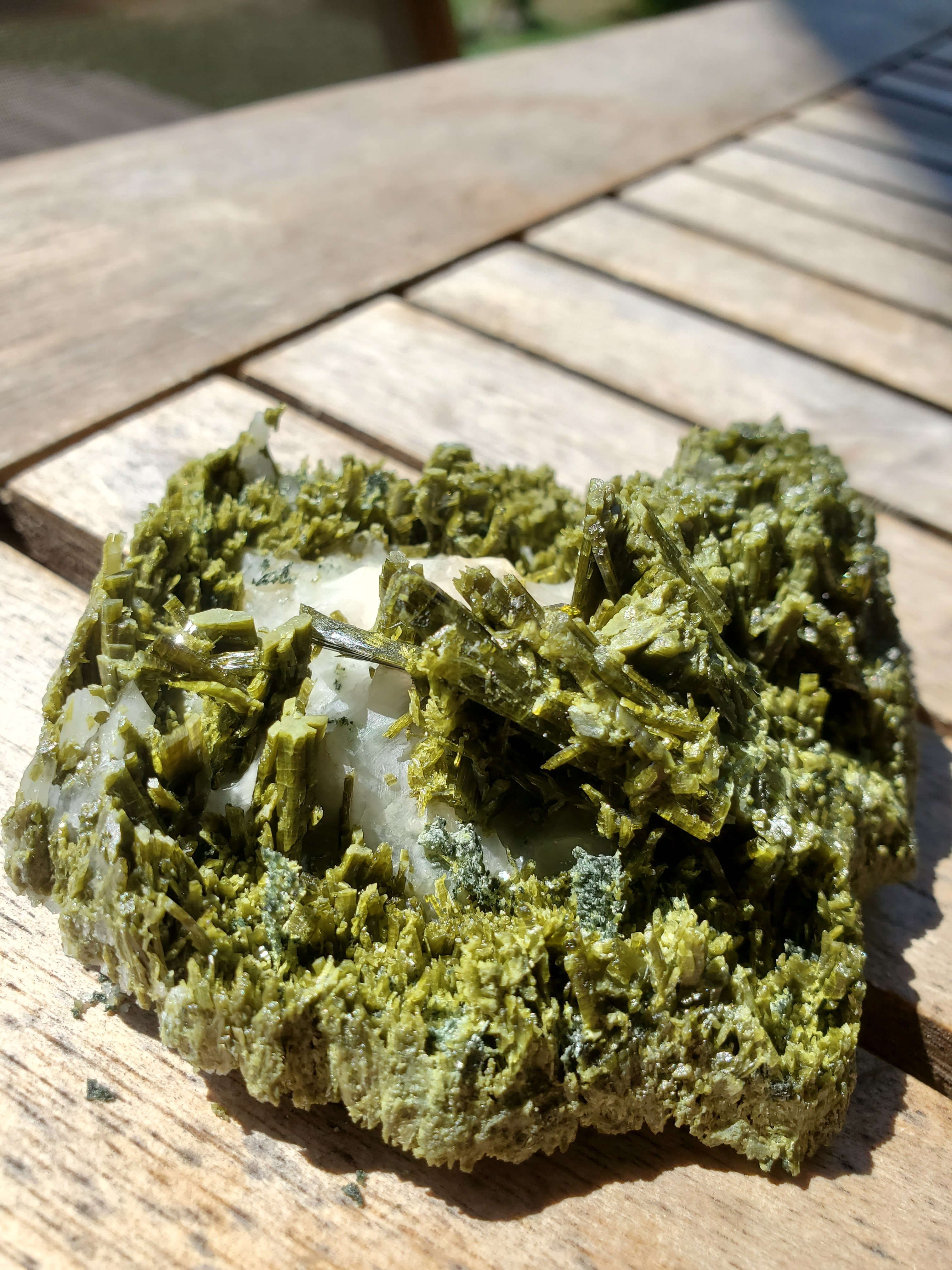 L epidote est souvent combiné avec du quartz et de la calcite, voir même de la pyrite. Les epidotes suivantes étaient prise dans la calcite, j ai donc utilisé de l acide chlorhydrique pour dégager les aiguilles.20230819_151702.thumb.jpg.cd5fb2f4d264a8098481990060767f2b.jpg