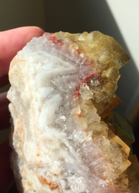 la mienne : au dos fluo verte cristallisée + liseré rouge + première cristallisation en cube jaune (hématoïde ?) avec inclusions puis seconde cristallisation (en fait poursuite de la croissance des cubes mais on voit bien un arrêt ou une venue de sulfure ou d'oxydes car certains cubes cassés montrent cette sous couche) puis lame de quartz à petit cristaux