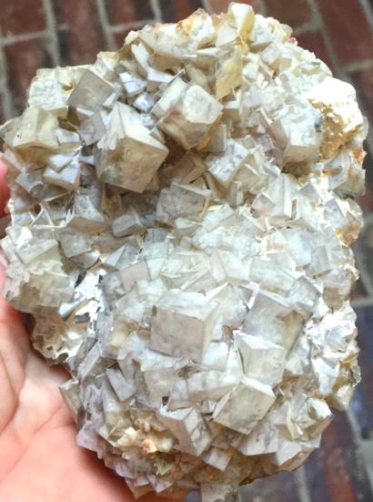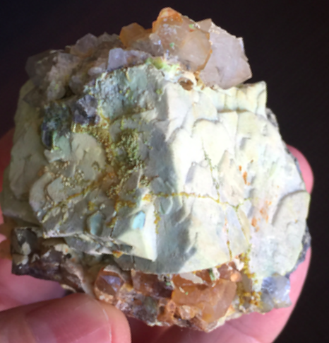 J'imagine qu'un premier quartz prismatique/calcédonieux s'est déposé. Puis de la pyrite. Une phase oxydante qui corrode à peine la pyrite et dépose un oxyde sur le quartz (probablement de la goethite du fait de la variété de couleurs, mais de pourrait aussi être de l'hématite, limonite, lepidocrocite……???), puis retour de la silice qui fige l'oxyde mais pas la pyrite (ou la silice sur la pyrite n'a pas tenue). La fluorine cubique est secondaire (ou tertiaire ou plus) à L'Argentolle.