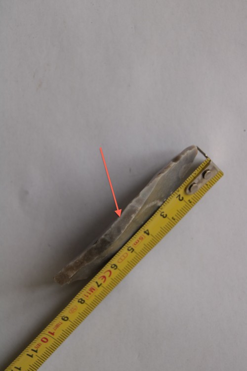 Le débitage de lame en silex nécessite une préparation du bloc initial de silex. Une fois que le bloc est bien préparé le débitage de lame peut s’enchaîner presque les unes à la suite des autres. Une préparation importante et la mise en place de crête qui vont guider l'onde de choc. La première lame sortie est appelée lame à crête car cette crête est encore très visible. Ici sur le bord gauche de la face supérieure on distingue les proximaux des enlèvements bien antérieurs qui ont mis en place une crête. Donc puisque cet éclat porte les stigmates d'une crête antérieur on parle d'éclat (ou lame) sous crête.