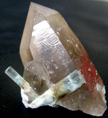Béryl aigue-marine sur orthoclase, avec tourmaline noire, et opale hyalite, Erongo, Namibie.