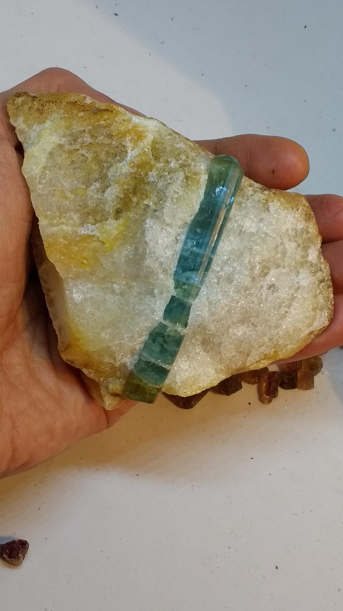 Merci Greg la veine, beaucoup plus petit et encore plus rare/anecdotique pour l'Aïr, Niger, béryl vert/émeraude, a déterminer, d'Elmeki dans des veines claires a dominance feldspath et biotite recoupant des micaschistes noirs en bordure d'un pluton granitique intrusif alcalin a biotite (tres riche en cassitérite).
