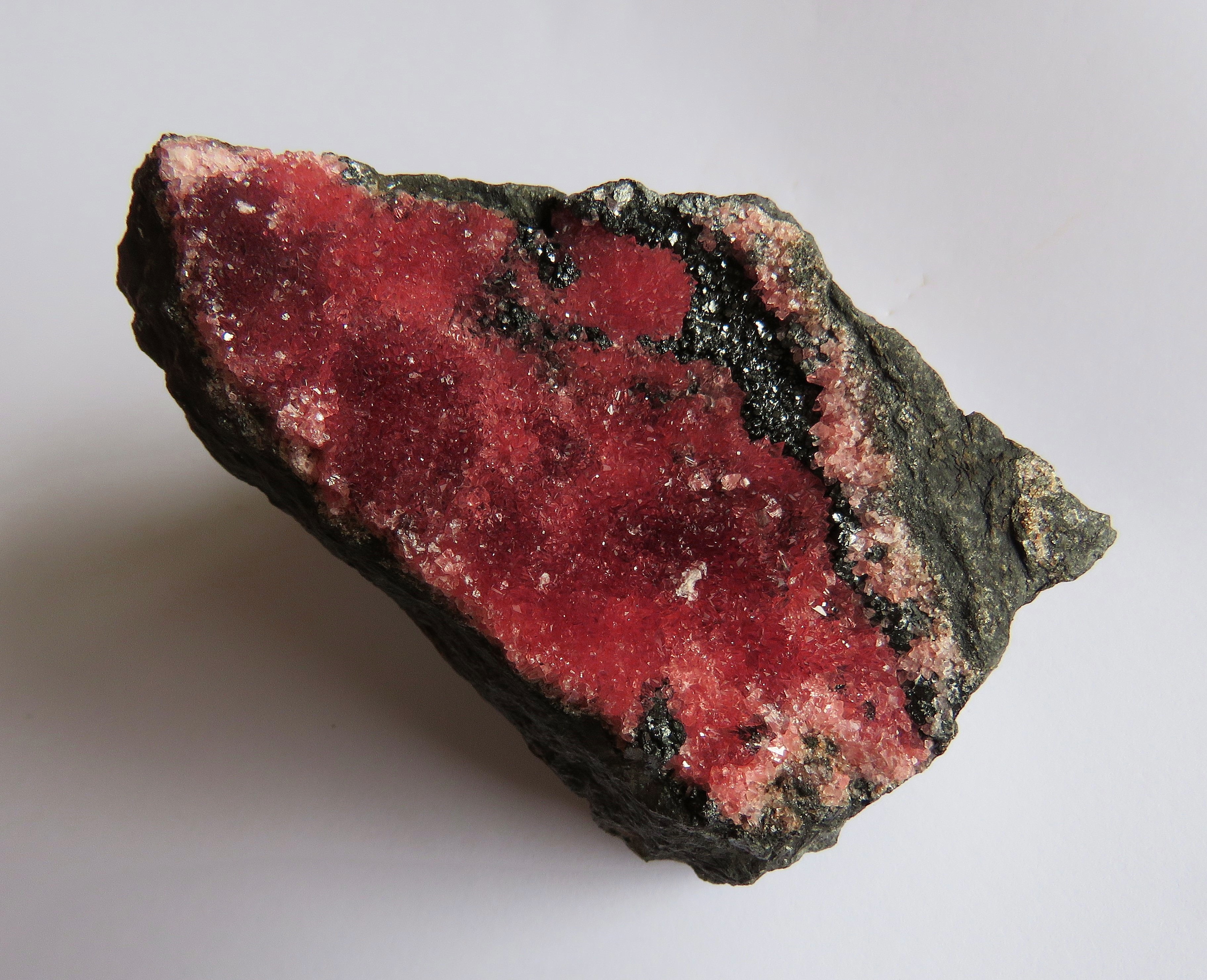 Les cristaux sont des scalénoèdres aux terminaisons complexes et variées; ils sont petits, de 1 à 2 mm libres, mais la couleur dominante de l'ensemble est unique parmi mes rhodo: c'est un rouge-rose "coulis de framboise", bien saturé !