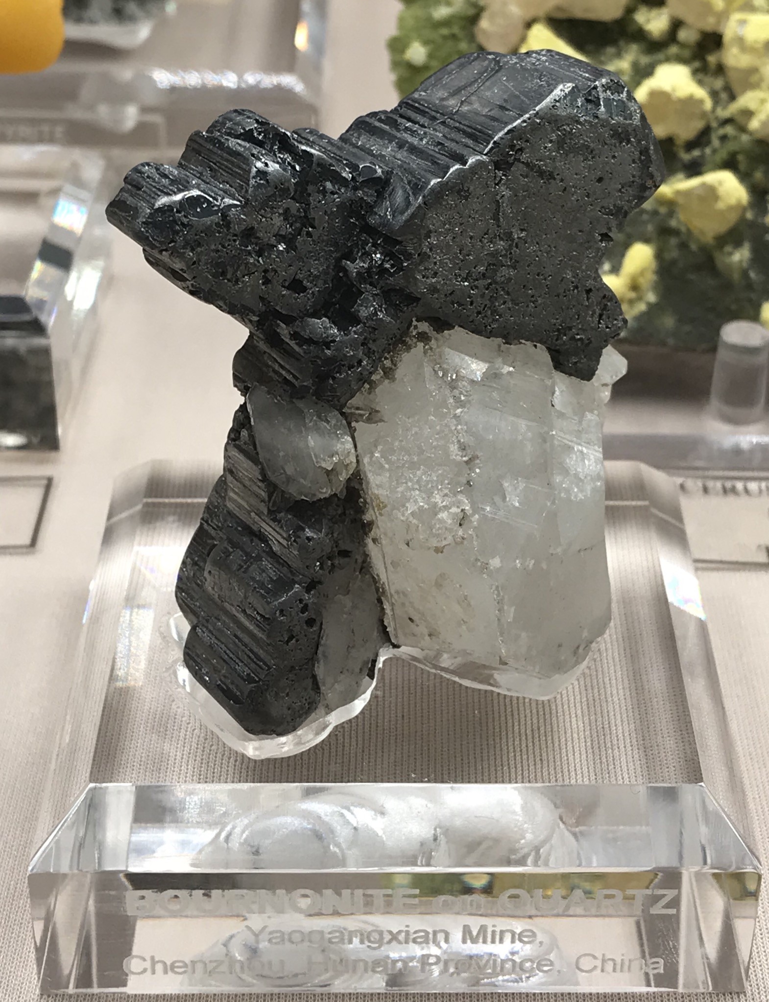 Cristaux de Bournonite sur cristaux de quartz, mine Yaogangxian, Yizhang, Chenzhou, province du Hunan, Chine.