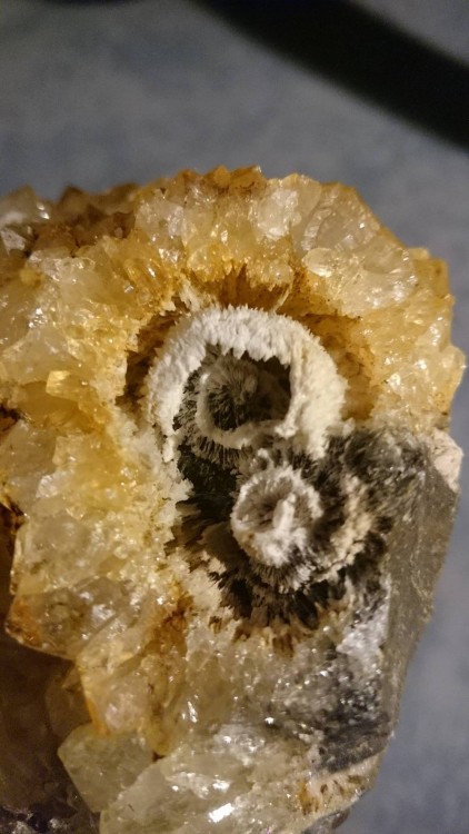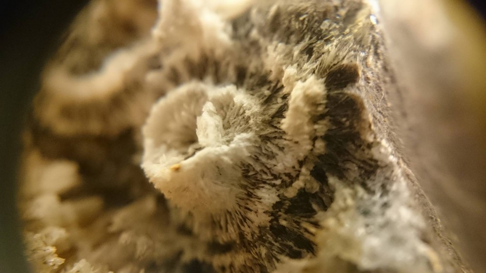 Apres avoir gratter du coté des sable d'Olonne dans le coin à quartz décrit par le sablais dans sont superbe post sur la Vendée (ici celui de la mine ) j'ai ramené ce beau plaquage de quartz avec ce que je pense être un pseudomorphe composé de quartz mais quel minéral était présent à la base ?? pour info ne réagit pas à l'acide et dureté non testé vu l'échantillon... la matrice est du lias silifié. J'ai fais des photos avec les moyens du bord, les trois dernières sont grossis (loupe x10)