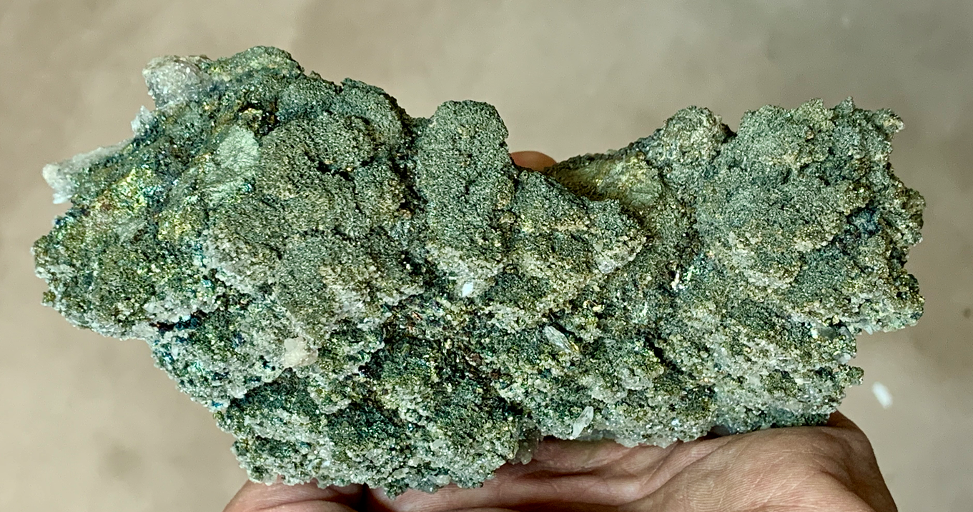Epaisse incrustation d'un mélange grenu de cristaux de Pyrite 'melnikovite' et Chalcopyrite 'blister copper' sur Quartz 'pyramidal' ; incrustation de Calcite incolore [180mm]