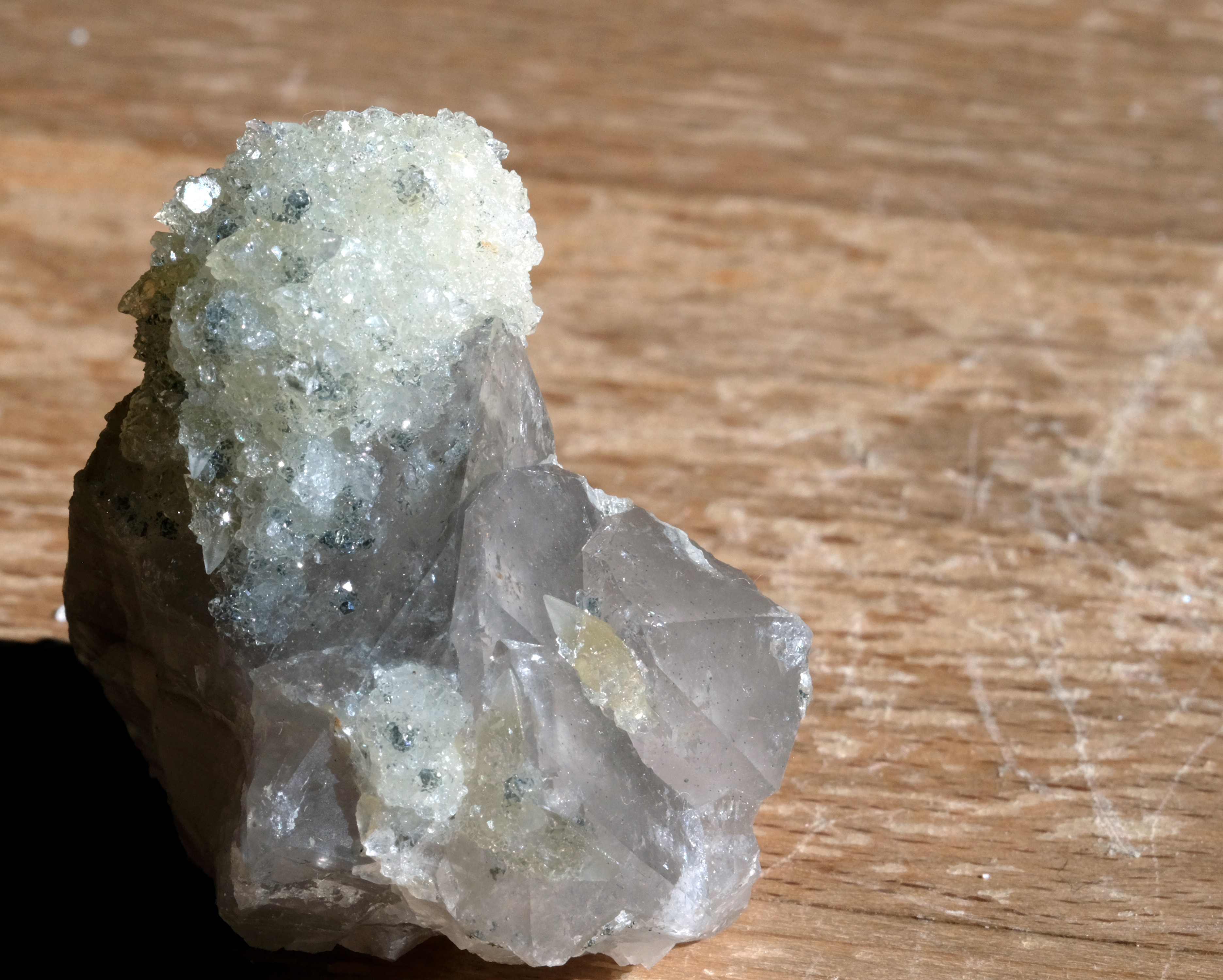Sphérosidérite verte sur quartz pyramidal légèrement enfumé ? Il semble y avoir aussi un cristal de calcite qui a poussé à la jonction entre deux cristaux de quartz et il est orangé dans sa partie médiane. Pourquoi ?