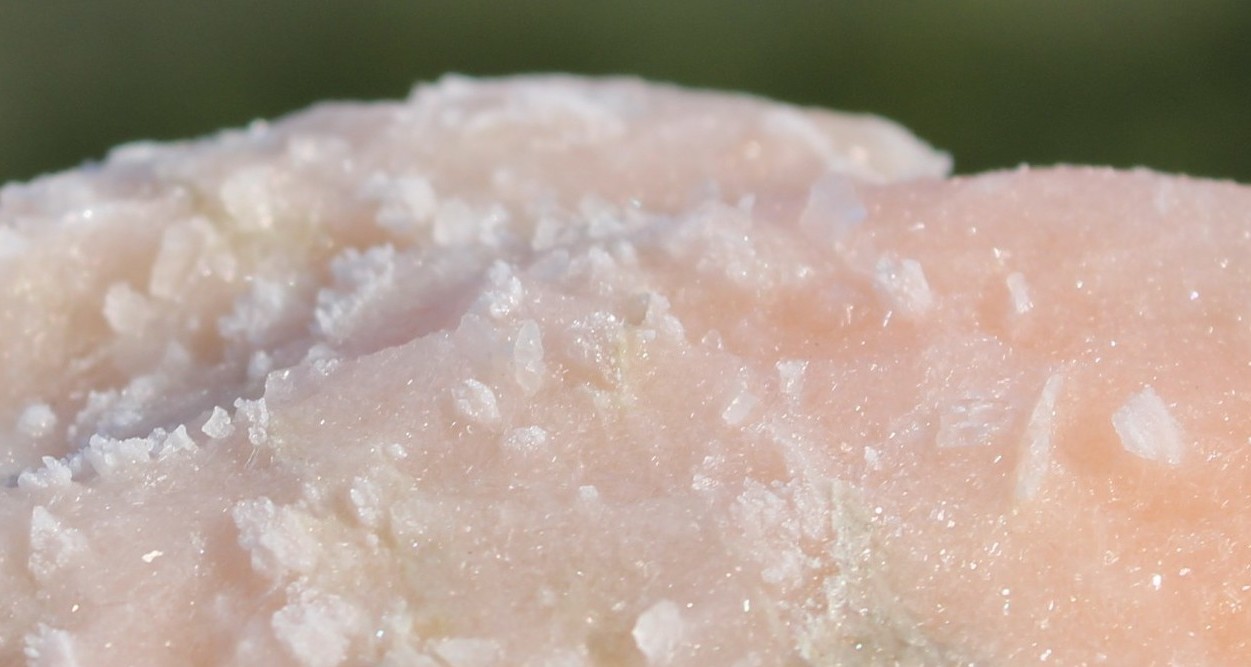 La réaction démarre par une conversion (pseudomorphose) des grains de calcite en gypse, donnant ces pelotes d'épingles, dont le cœur est encore du carbonate :