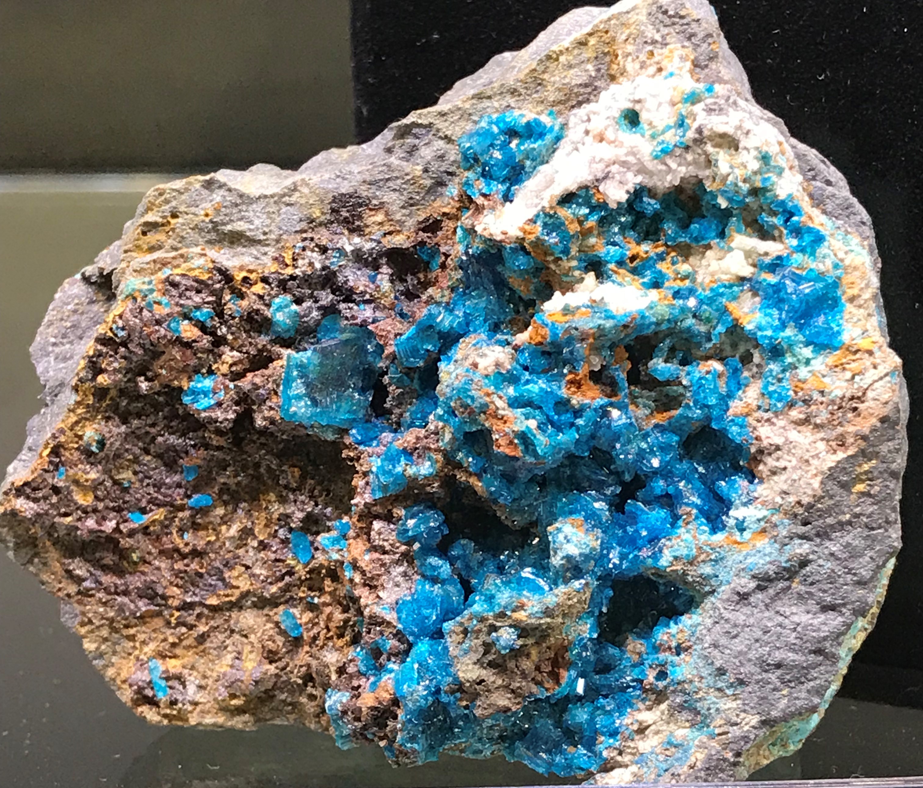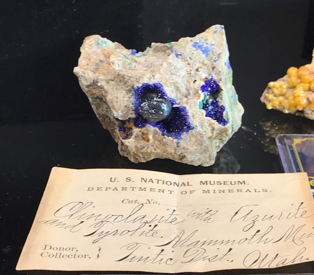 Clinoclasite et azurite, avec tyrolite, mine Mammoth, Utah, USA.