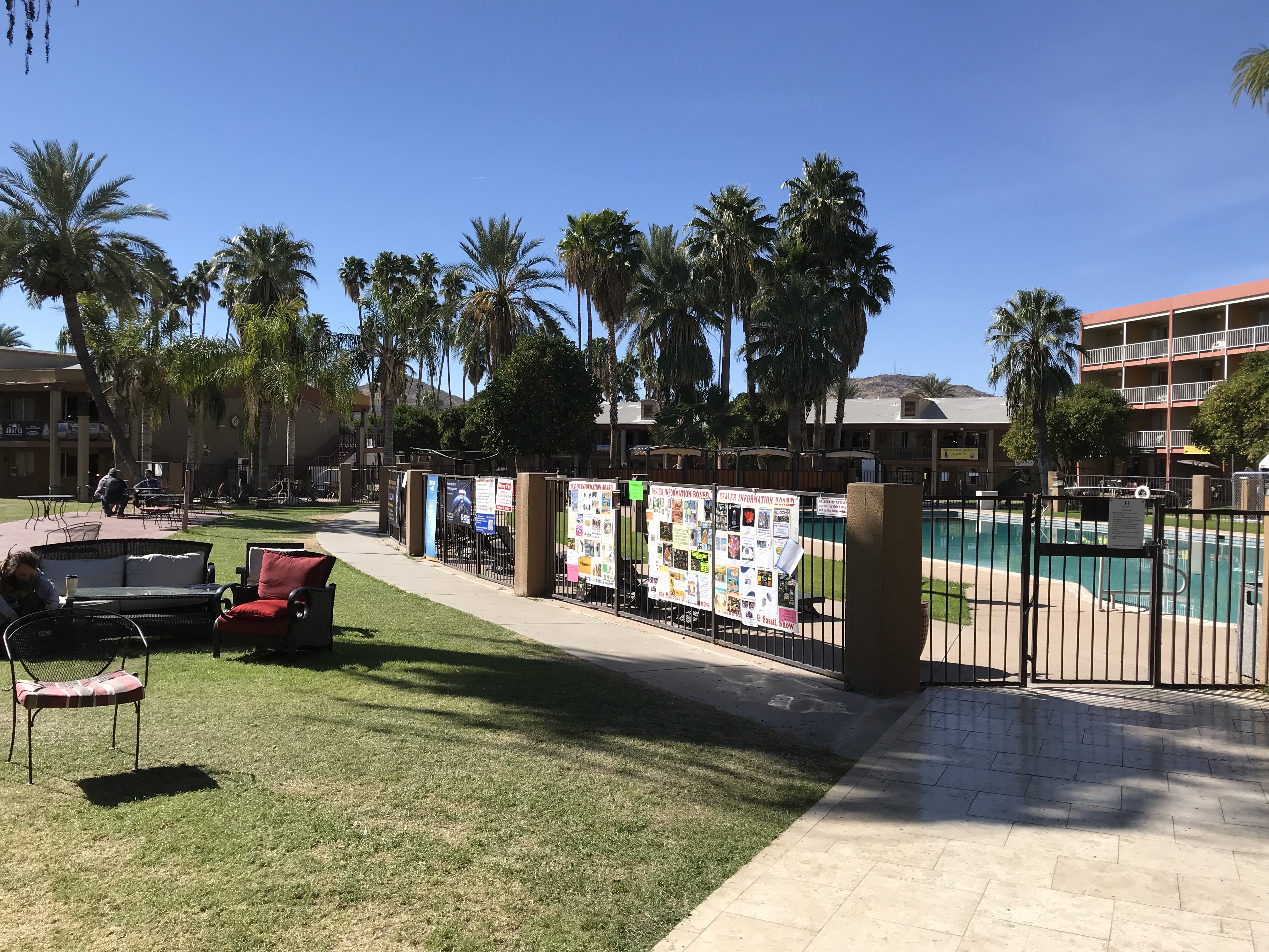 Une fois entrée dans le Hall de l'hôtel qui abrite le Arizona Mineral & Fossil Show, où se trouvent déjà divers marchand, on passe dans le jardin où se trouve la piscine, le tout entouré d'autres bâtiments de l'hôtel, avec la suite des chambres.