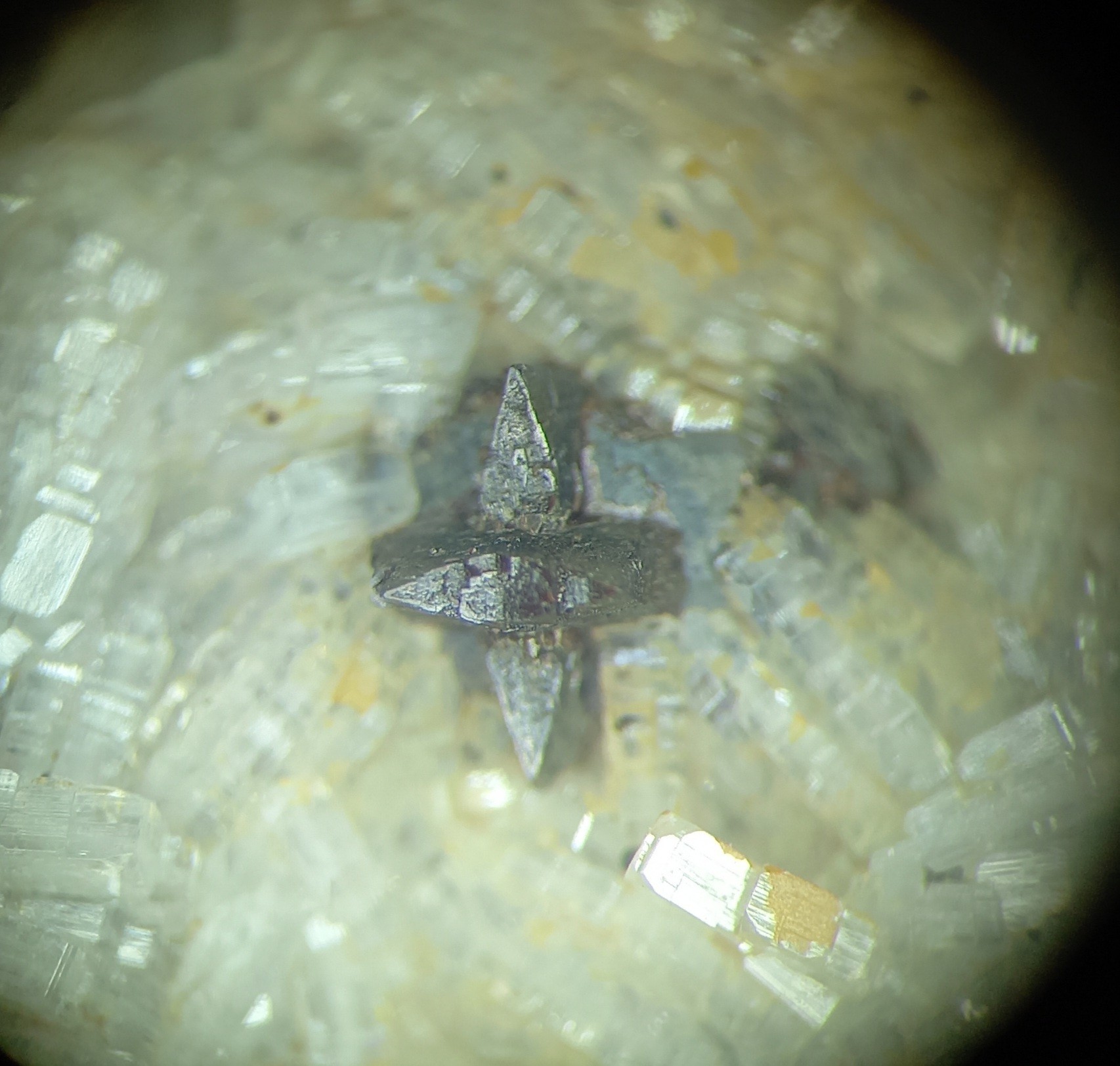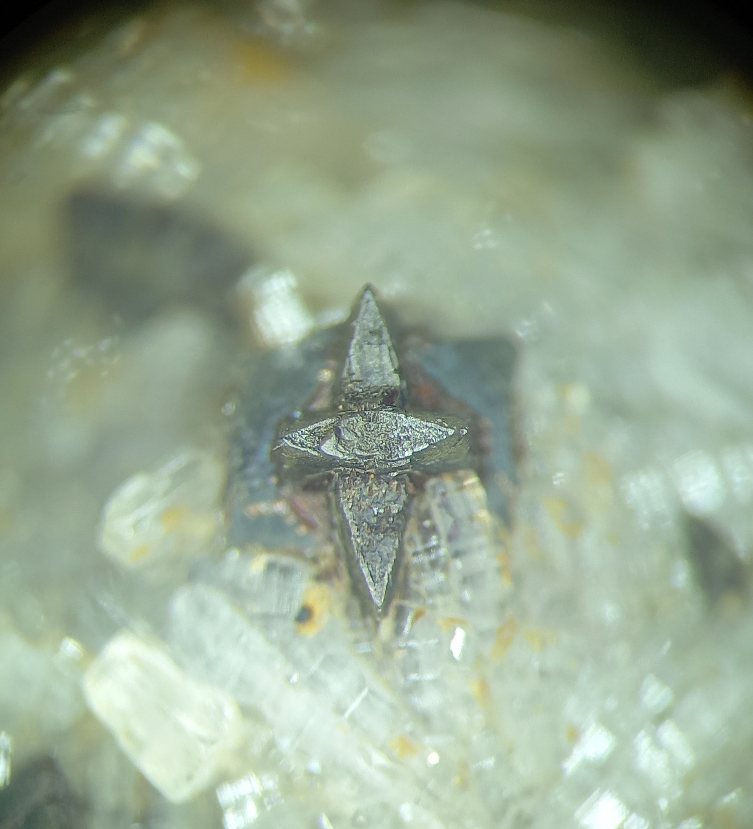 Du petit mais mimi de Lozère, dans la dolomie hettangienne, Cham des Bondons: marcasite pseudomorphosée en goethite, donc noire, en macle queue d'aronde et en croix (ou anis étoilé, au choix), sur barytine tabulaire.