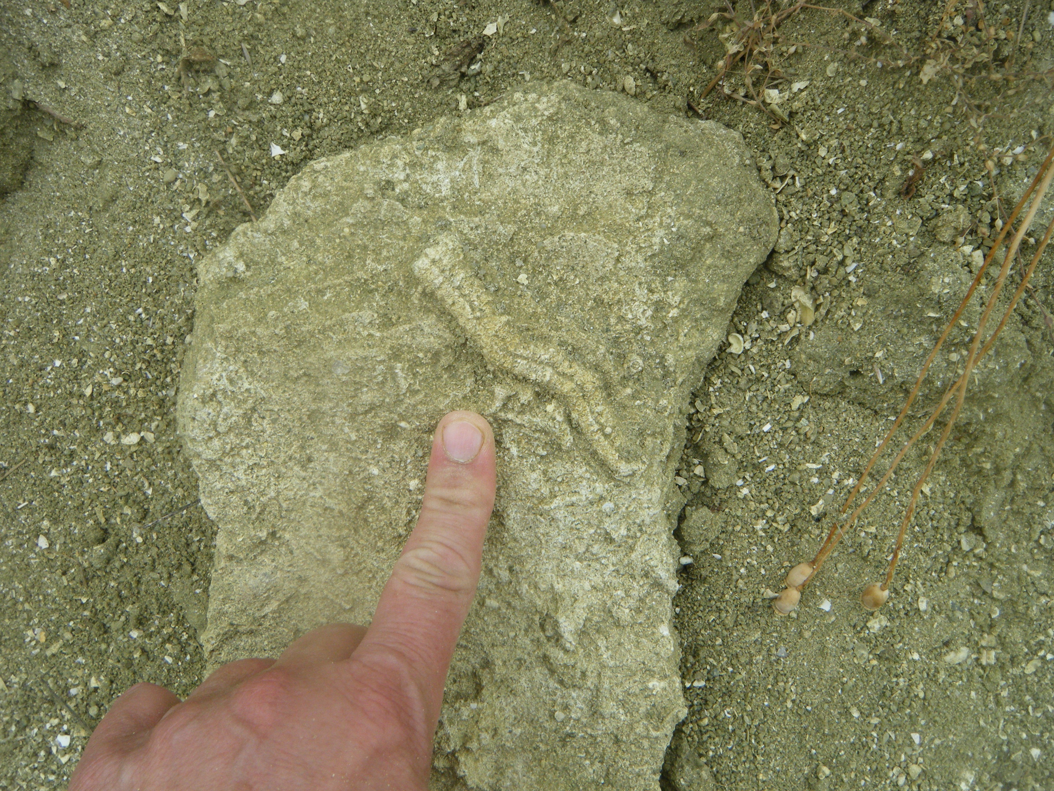 Trouvé il y a quelques semaines déjà, et identifié comme étant une trace de déplacement d'un oursin de type Spantangue, et étrangement il y avait effectivement un tel oursin de l'autre coté de la plaque.