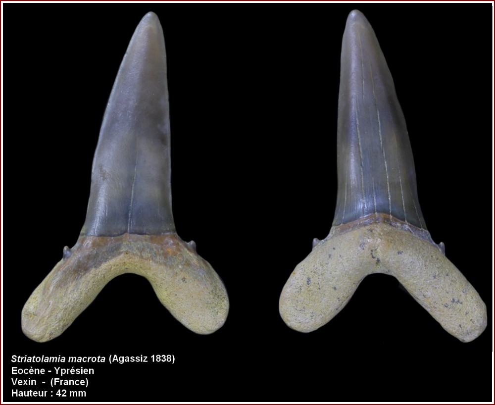 Voici quelques dents de requin (Striatolamia macrota?) du Lutétien, récoltées par tamisage à Gisors il y a une dizaine d'années dans la carrière qui s'ouvrait à l'entrée de la ville en venant de Cergy-Pontoise.