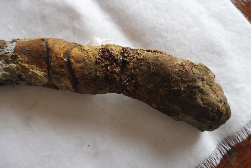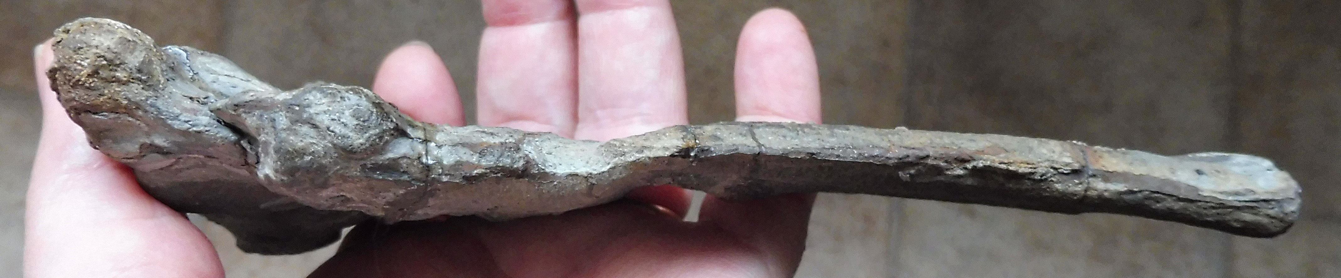 En procédant par élimination (pas un vestige de végétal, ni un terrier fossilisé), et examen de la surface non corrodée à la binoculaire, il ne me reste que la matière osseuse pour expliquer cet objet. Il mesure 42 cm de longueur, et 2,8 cm de largeur (relevée au milieu de la partie allongée). Il est très fortement imprégné de pyrite. La zone corrodée se trouvait à l'affleurement en paroi de talus. La partie élargie est encore exempte de corrosion, car elle se trouvait dans la marne compacte. Par comparaison avec les vertèbres d'ichthyosaures trouvées à l'occasion dans les marnes toarciennes,  la nature osseuse de cet objet est de loin la plus probable: ils sont toujours plus ou moins imprégnés de pyrite, et se corrodent rapidement à l'affleurement et en subsurface. Toutefois, c'est le seul objet de ce type que j'aie jamais trouvé dans le Domérien, et dans le Toarcien aussi d'ailleurs.