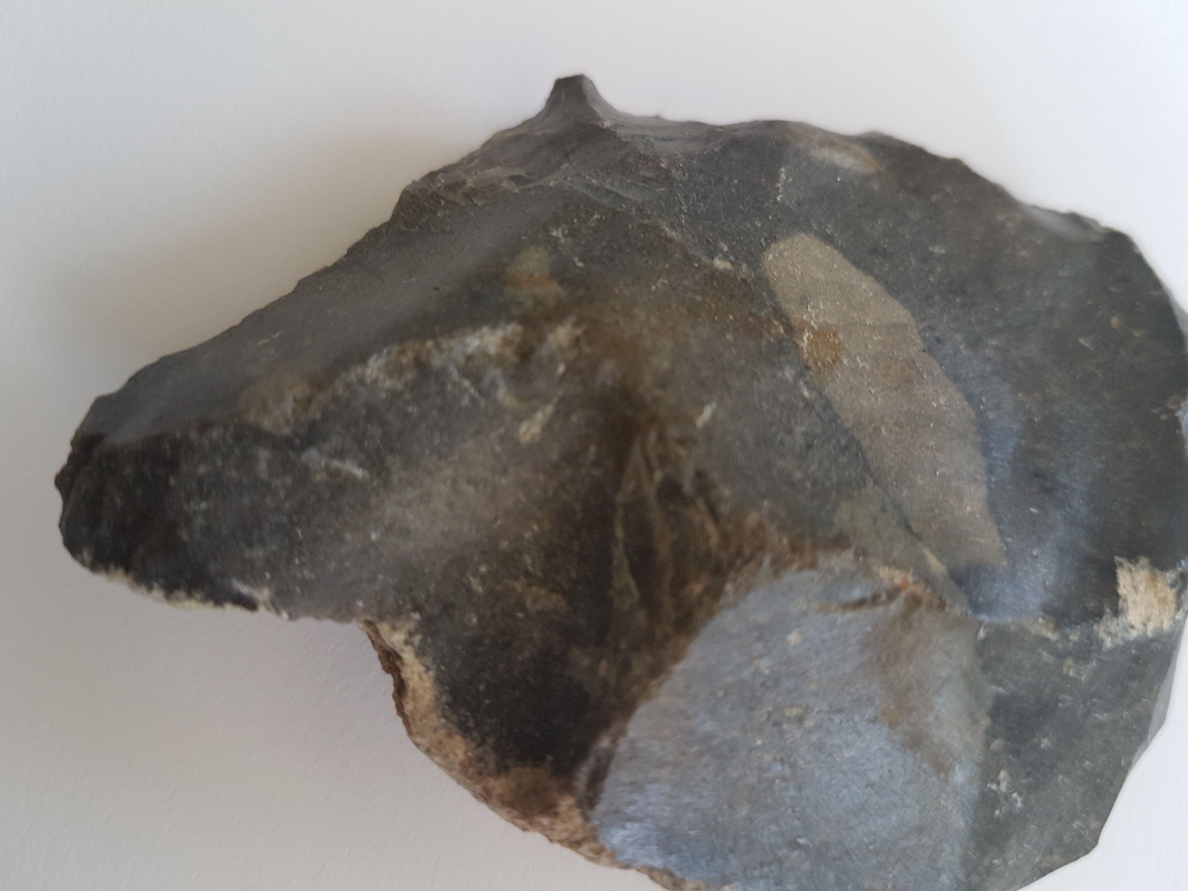 J'ai trouvé il y a quelques jours ce silex dans un talus fraichement créé chez mon beau-frère (terre amenée a priori de la commune de Montivilliers dans le 76, mais on n'en sait pas plus). C'est sa forme particulière qui m'a de suite interloqué.  En effet, j'ai travaillé quelques temps au Muséum d'histoire naturelle du havre et j'ai eu l'occasion de trier pas mal de cartons rempli de silex issu de fouille archéologique amateur afin de récupérer éventuel grattoir, pointe, lame, pointe de flèche ect ...