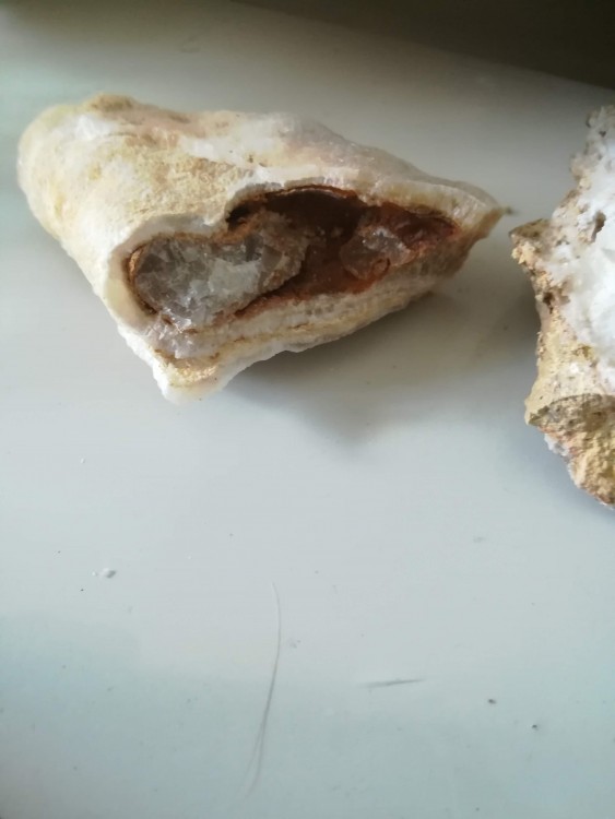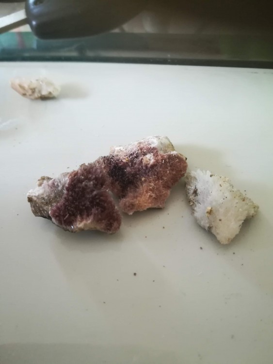 Alors voila, je suppose après recherche que c'est uniquement du quartz (cristal de roche) et du calcaire mais je demande confirmation. J'aimerais également savoir d'ou provient le côté violet d'une des pierres. Pour information, l'endroit était très argileux et se trouve en Lozère vers Mende.