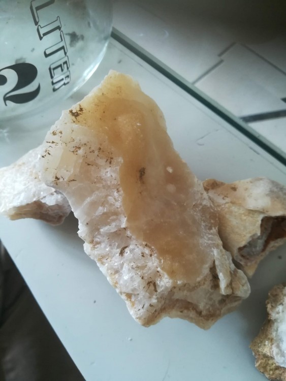 Suite à ton test de rayure sur verre, maintenant tu peux conclure que ce n'est pas du quartz (dureté 7) mais de la calcite (dureté 3) rayable également avec cuivre pur sinon un couteau, aiguille....(faute de grive, on mange du merle).