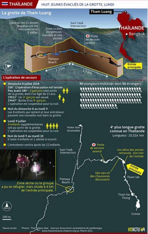 Cinq siphons les séparent de la sortie, dont quatre bigrement longs. Environ 4 Km c'est très très long sous terre et là c'est super compliqué comme secours, mais je ne pense pas que leur vie soit en danger, sauf mentalement, mais là aussi je ne suis pas trop inquiète (il y a surement des plongeurs spéléos qui sont médecins dans les équipes de secours). Il faut rester patient. J'espère seulement que cette cavité ne se mettra pas en charge complètement.