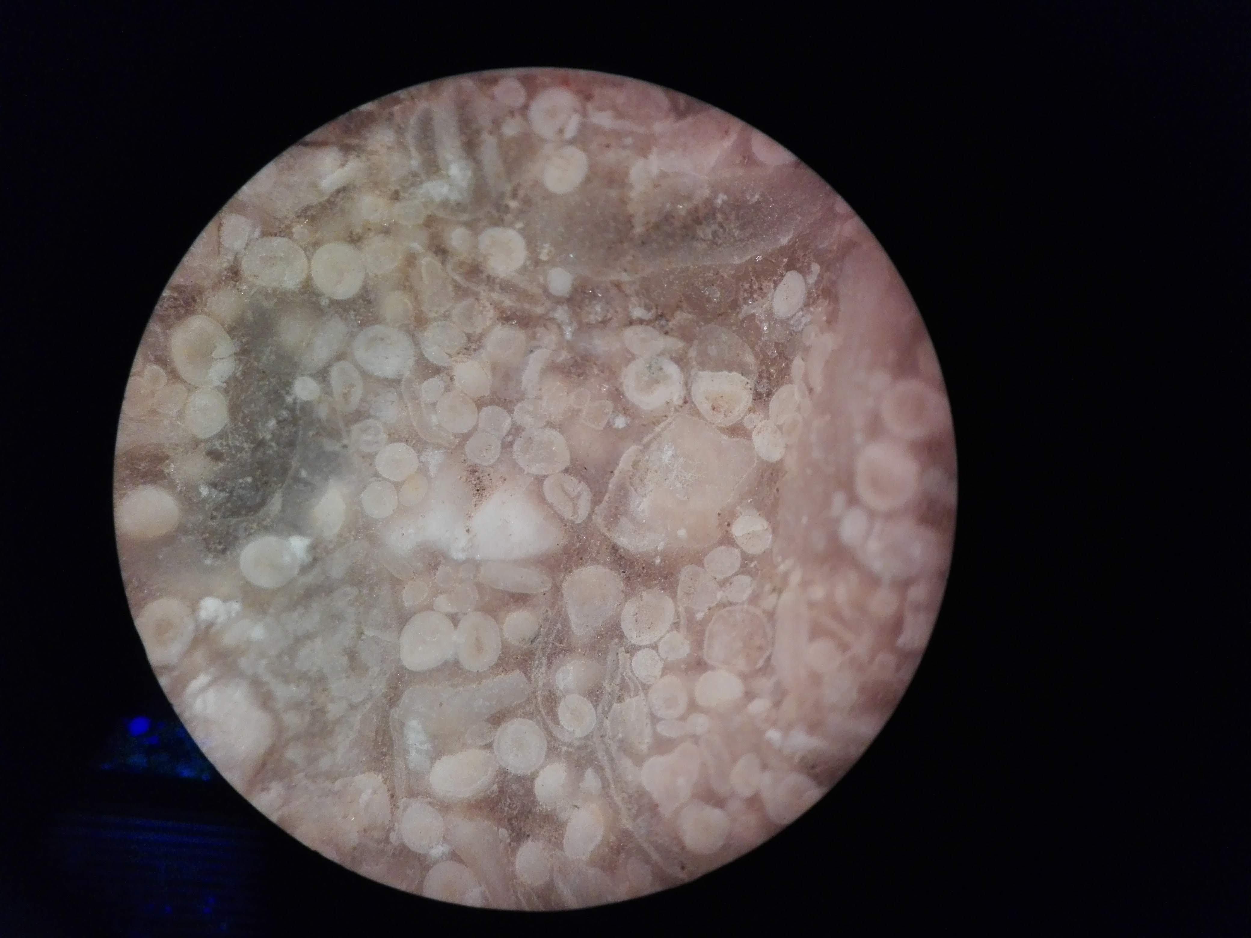 Je ne serais pas surpris qu'il s'agisse d'une formation à oolithes qui a évolué durant la diagénèse. Je trouve notamment, perso, que la structure des oolithes est fantomatique au vu des photos prises sous bino et qu'on pourrait qualifier ce calcaire de peltoïdique.