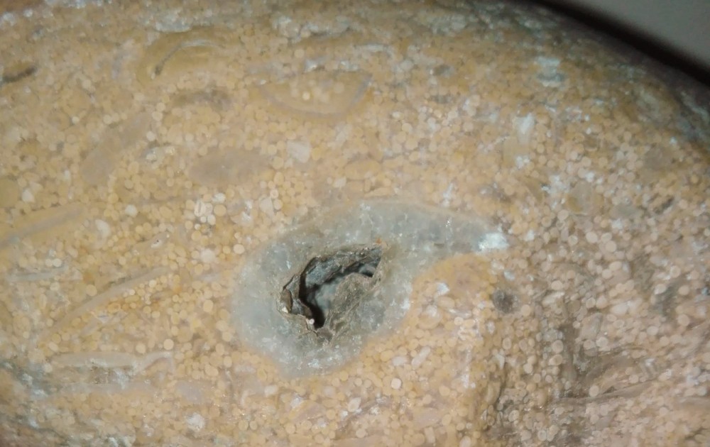 Bonjour à tous, je suis récemment parti en voyage dans le Jura français, à Moirans-en-Montagne pour être plus précis, et pendant l'une de mes randonnées, à environ 1km du barrage de vouglans (rive sud), j'ai trouvé une pierre assez étrange composée de petits ronds et remplie de petits cristaux… (je l'ai trouvée dans le lit d'un ruisseau asséché pour l'instant)